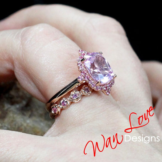 Set di anelli di fidanzamento allungati con zaffiro rosa chiaro con taglio a cuscino, set da sposa vintage, anello con alone antico a grappolo, fede nuziale con fiore di rosa