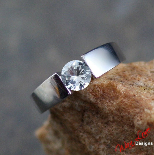 Vendita campione pronto per la spedizione: anello di fidanzamento con zaffiro bianco, anello solitario, anello con set di tensione, design, 1 ct, 6 mm, argento rodiato, anello di tensione