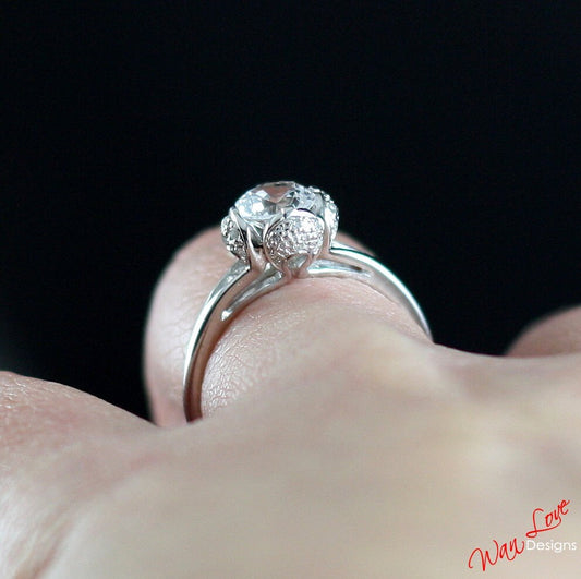 Anello di fidanzamento con zaffiro bianco e diamante, fiore di tulipano, gambo diviso, rotondo, 1 ct, 6 mm, argento rodiato, regalo di anniversario di matrimonio, pronto per la spedizione