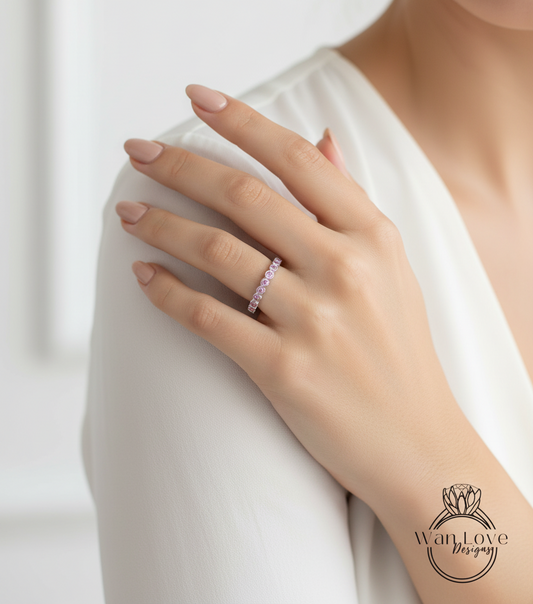 Vendita campione Pronto per la spedizione: set di castoni circolari in zaffiro rosa, fede nuziale completa per l'eternità, anello impilabile, fidanzamento, regalo di anniversario