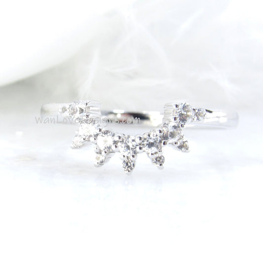 Fede nuziale con zaffiro bianco Sunburst, annidamento, curvo, taglio rotondo, anello di fidanzamento-oro bianco-anniversario personalizzato-pronto per la spedizione Anelli