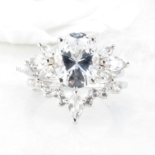 Set di anelli di fidanzamento con zaffiro bianco ovale da 3 ct, set di anelli con zaffiro bianco con marquise laterale, fascia di nidificazione Chevron, set di anelli pronto per la spedizione