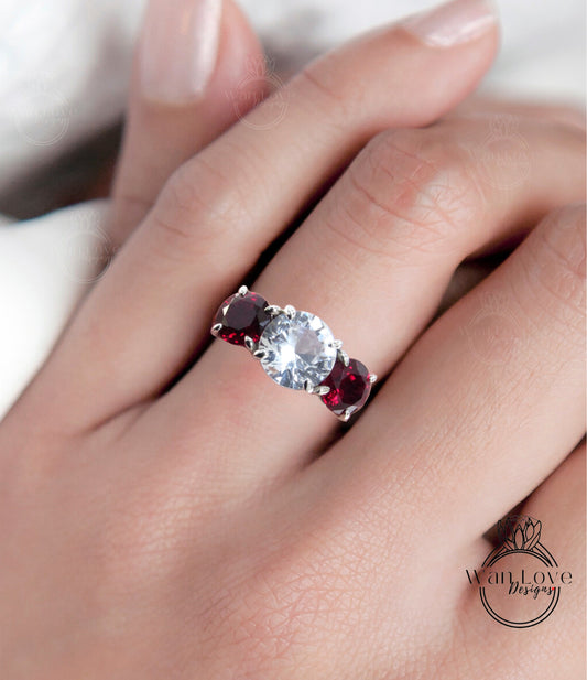 Anello di fidanzamento con 3 pietre di zaffiro bianco e rubino rotondo 3 pietre preziose 1 2 ct Anello di promessa di matrimonio nuziale Regalo di anniversario - Pronto per la spedizione