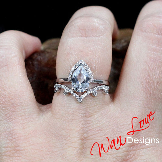 Pera zaffiro bianco corona semi lunetta mezzo Halo anello di fidanzamento V Wedding Band Set 1.5ct set anello nuziale vintage in oro bianco-pronto per la spedizione