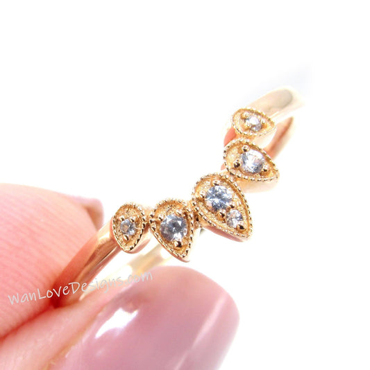 Fede nuziale in oro rosa con zaffiro bianco Fede nuziale da donna curva vintage fede nuziale con foglia di pera anello milgrain fascia anniversario-Pronta per la spedizione