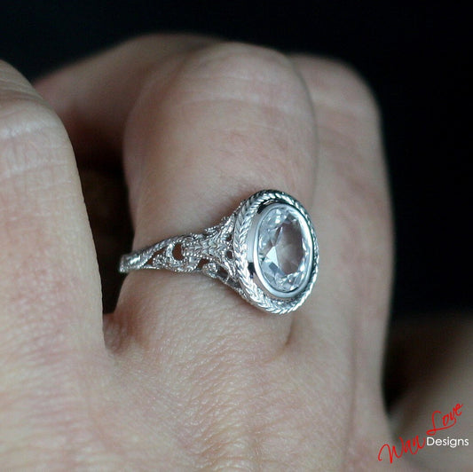Zaffiro bianco ovale lunetta filigrana Milgrain solitario anello di fidanzamento 3ct 9x7mm anello di promessa nuziale regalo di anniversario di matrimonio pronto per la spedizione