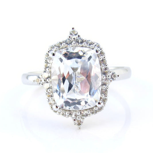 Anello di fidanzamento con zaffiro bianco con alone floreale unico da 4 ct, anello con zaffiro a cuscino allungato, anniversario di matrimonio nuziale in oro bianco, pronto per la spedizione