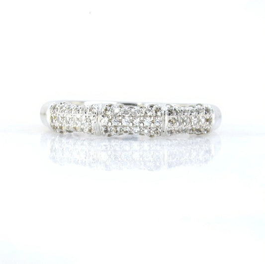 Fede nuziale in bambù con zaffiro bianco Anello naturale con intaglio Mezza eternità con pavé in oro bianco Anello unico per l'anniversario nuziale abbinato-Pronto