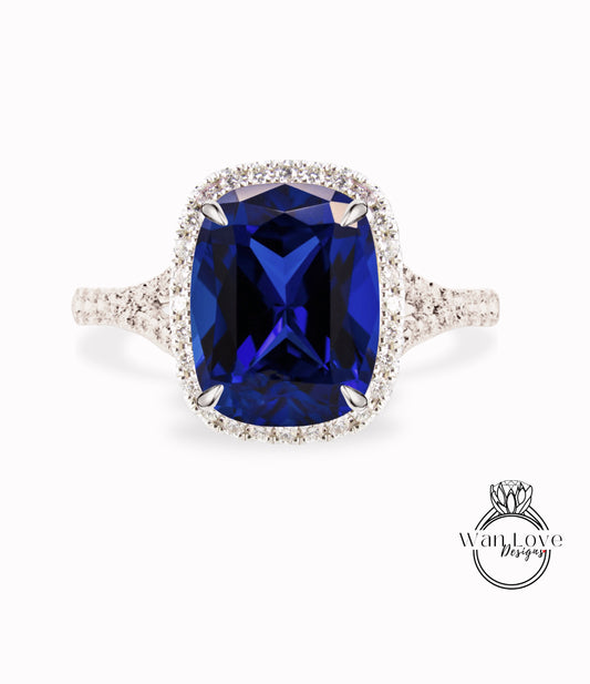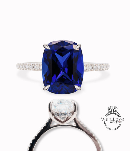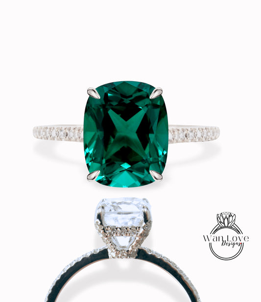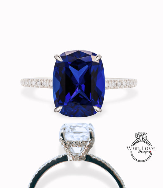 Anello di fidanzamento con punte di cesto di Halo laterale smeraldo con diamanti in zaffiro blu, anello cuscino allungato, personalizzato, matrimonio, anniversario