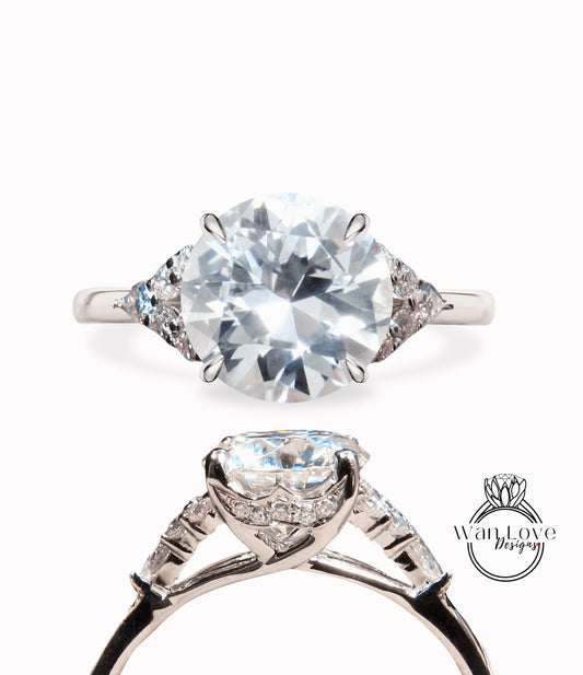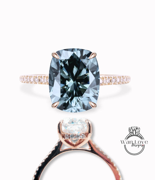 Anello di fidanzamento Halo laterale con diamante zaffiro bianco, Anello Halo laterale con cuscino allungato, Anello cestino con punte di diamante, Personalizzato, WanLoveDesigns
