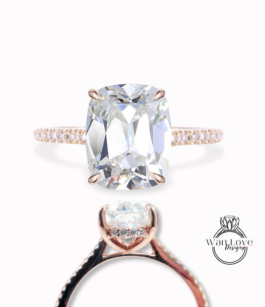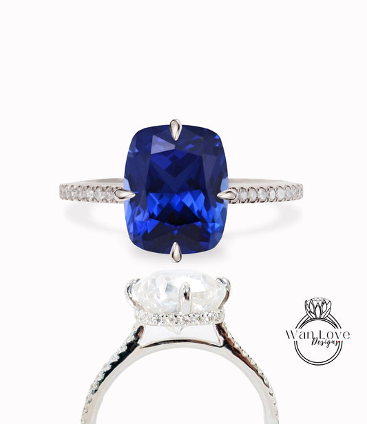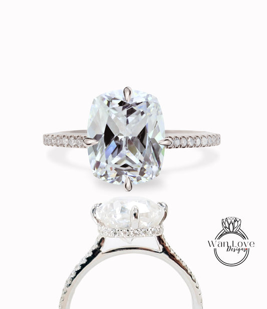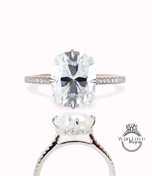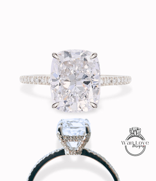Anello di fidanzamento Halo laterale con diamante zaffiro bianco, Anello Halo laterale con cuscino allungato, Anello cestino con punte di diamante, Personalizzato, WanLoveDesigns