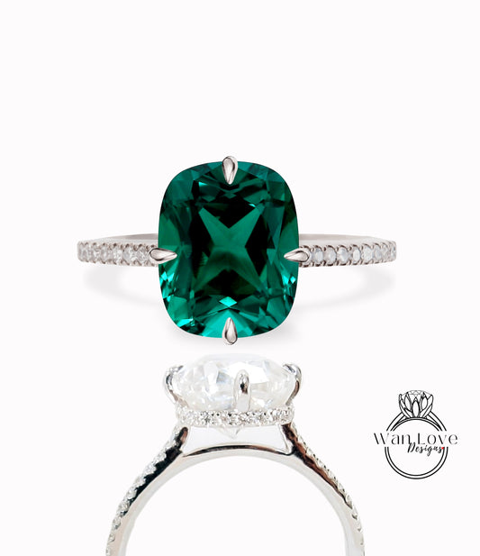 Anello di fidanzamento con smeraldo allungato taglio cuscino art deco, anello in oro rosa con diamante nascosto, anello con alone laterale, promessa di anniversario, anello nuziale