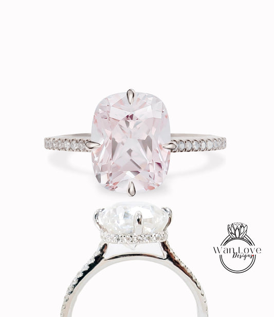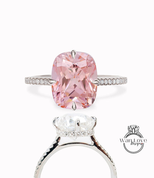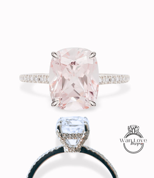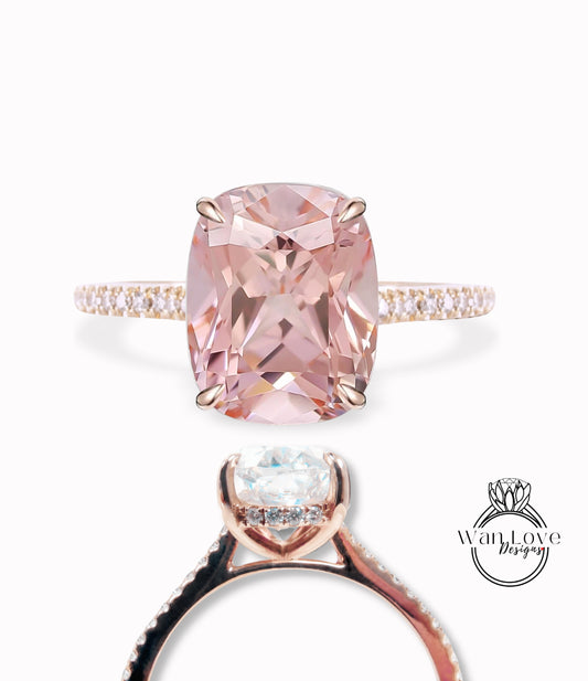 Anello di fidanzamento con alone laterale con cuscino allungato con diamante zaffiro rosa chiaro Stile celebrità personalizzato, oro 18kt 14kt-platino, WanLoveDesigns