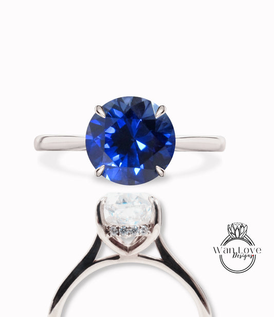 Anello di fidanzamento rotondo con zaffiro blu e diamanti, anello di fidanzamento rotondo, alone laterale, nascosto, 3/4 quasi eternità, personalizzato, matrimonio, anniversario