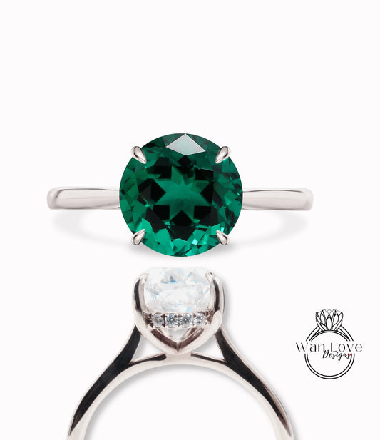 Emerald & Diamond Round side halo plain band Engagement Ring, Cathedral Basket 14kt 18kt Gold-Platinum-Custom-Wedding, Anniversary Gift