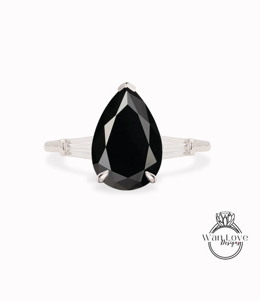 Anello di fidanzamento baguette affusolato con pera moissanite spinello nero 3 pietre preziose, personalizzato-14kt 18kt oro-platino-Weding, WanLoveDesigns
