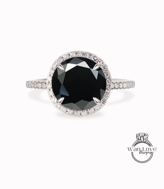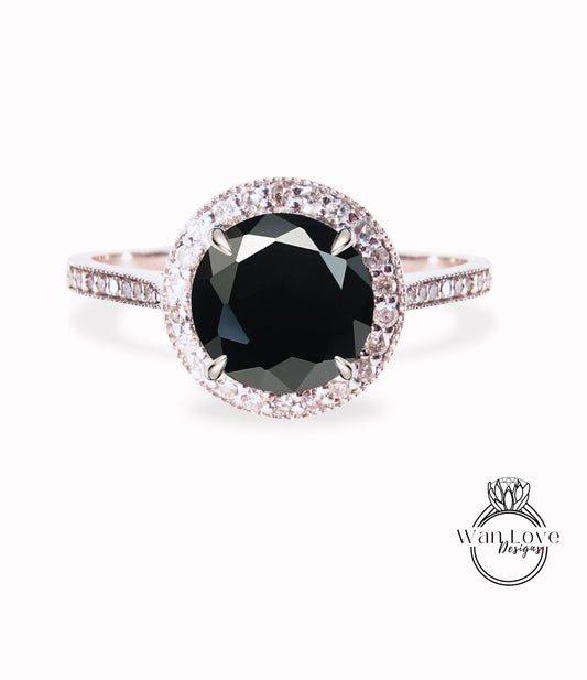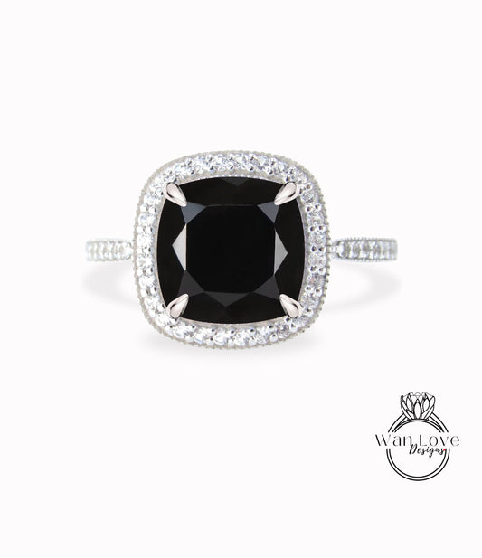 Cuscino Halo Anello di fidanzamento con spinello nero, Anello nuziale con diamante/Moissanite Halo, Anello personalizzato Half Eternity Diamond Milgrain, Anello in oro 14k/18k