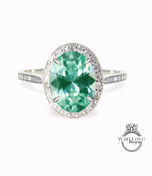 Anello di fidanzamento aureola ovale Teal Spinel Diamond 14k oro milgrain, anello di fidanzamento spinello verde blu, anello milgrain d'oro, ispirato vintage