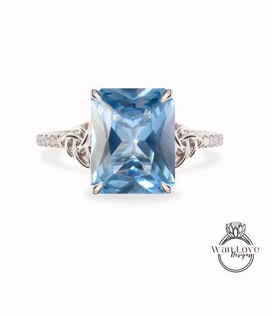 Anello di fidanzamento con spinello acquamarina celtica, oro rosa, diamante taglio smeraldo, anello nuziale con nodo celtico, regalo unico per l'anello di anniversario con promessa nuziale