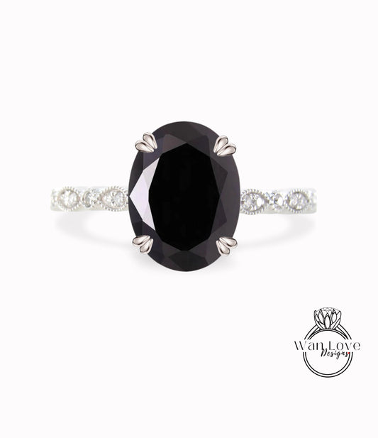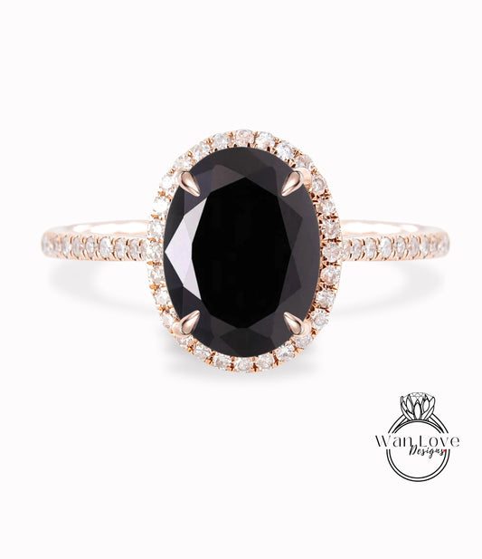 Anello di fidanzamento con spinello nero e diamante ovale East West Halo, personalizzato, 14k 18k bianco giallo oro rosa-platino-matrimonio, regalo di anniversario