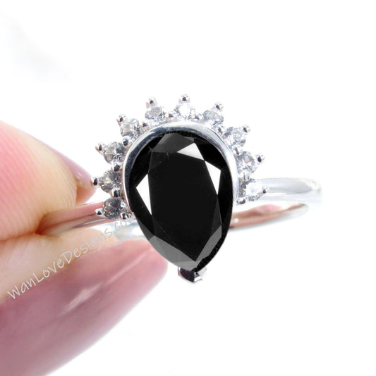 Anello con taglio a pera di spinello nero, anello semi castone, anello di diamanti Half Halo, anello di fidanzamento con spinello nero, anello Halo bianco e nero, WanLoveDesigns