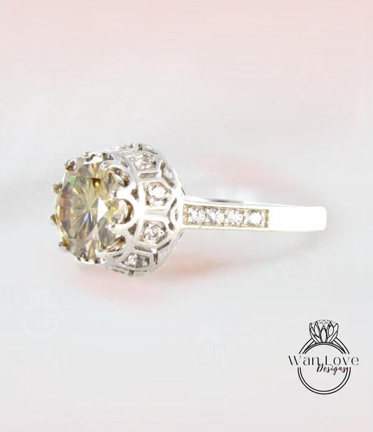 Anello di fidanzamento in filigrana con corona in stile vintage antico con diamanti Moissanite champagne, anello rotondo antico unico, anello nuziale nuziale