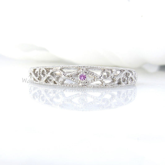 Fede nuziale unica in oro Anello unico vintage con zaffiro rosa. Delicata filigrana Hollow Promise impilabile con fascia abbinata Anello di promessa anniversario