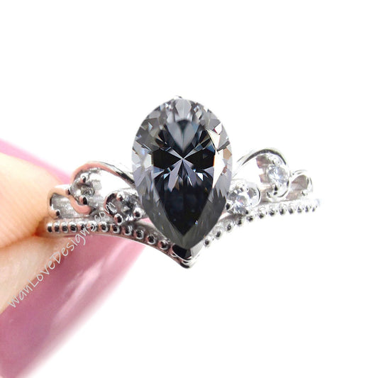 Anello di fidanzamento vintage con pera | Fede nuziale in moissanite grigia e chevron| Anello nuziale in filigrana a grappolo a forma di pera| Anello anniversario antico
