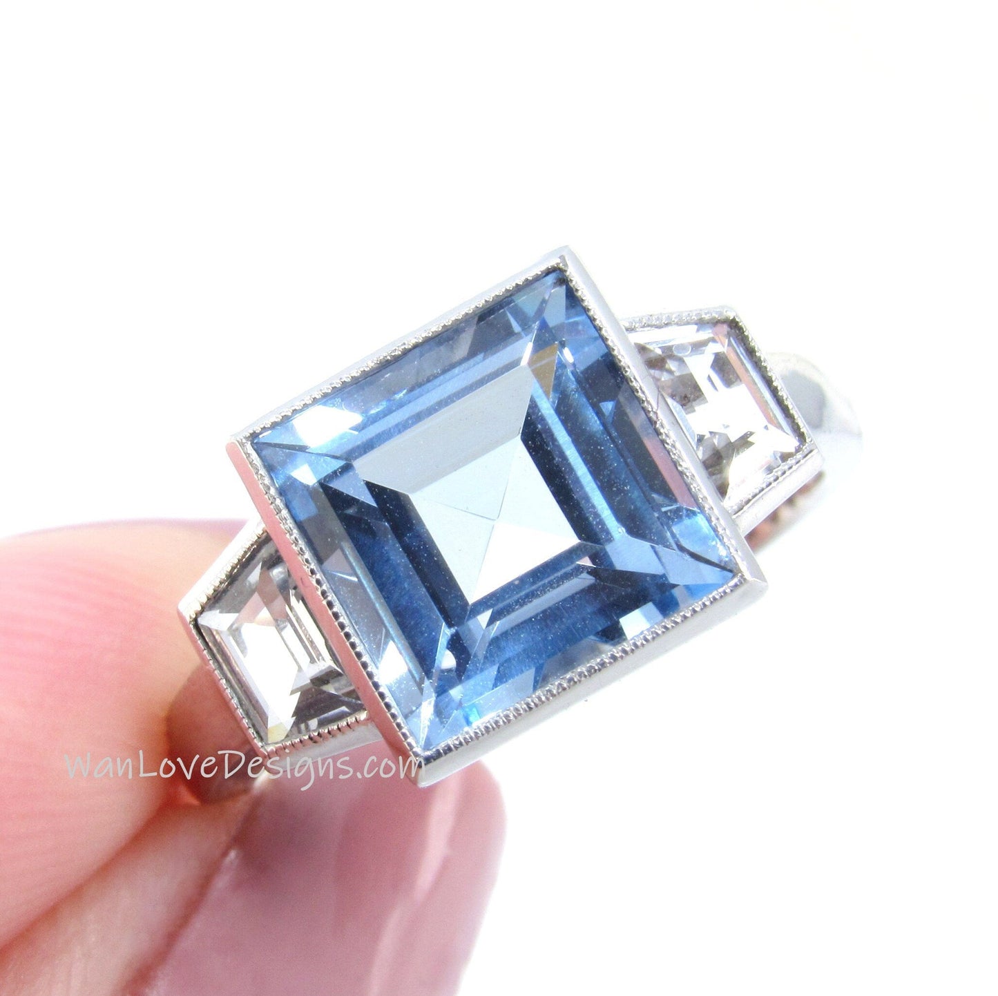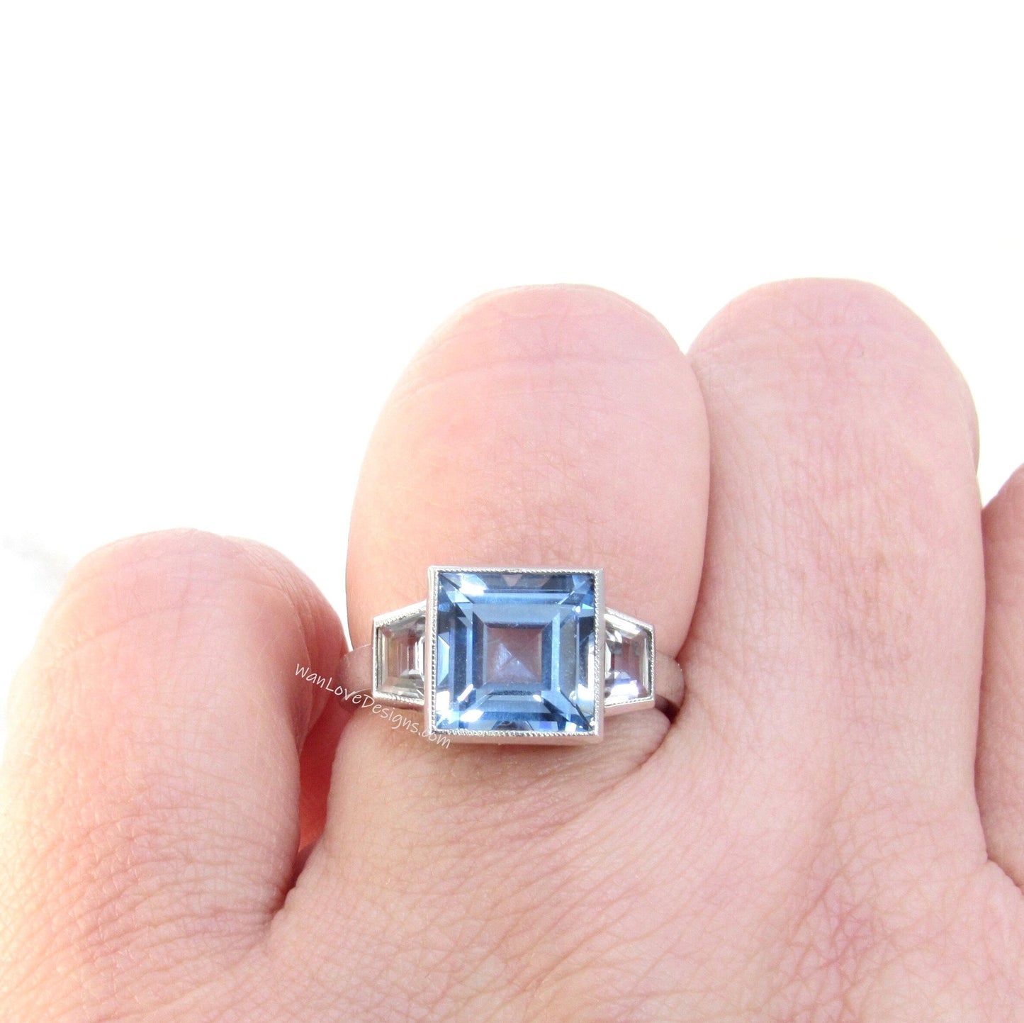 Anello di fidanzamento con spinello acquamarina taglio principessa da 3 CT, anello con castone Milgrain, anello nuziale con zaffiro bianco trapezoidale laterale, anello da sposa.