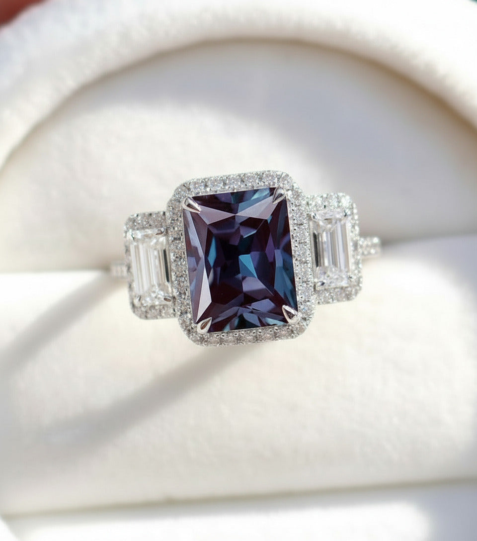 Anello Baguette con smeraldo Halo Alexandrite e diamanti, Anello di fidanzamento Art Déco, Anello con pietra laterale di diamanti, Anello con tre pietre Halo Diamond