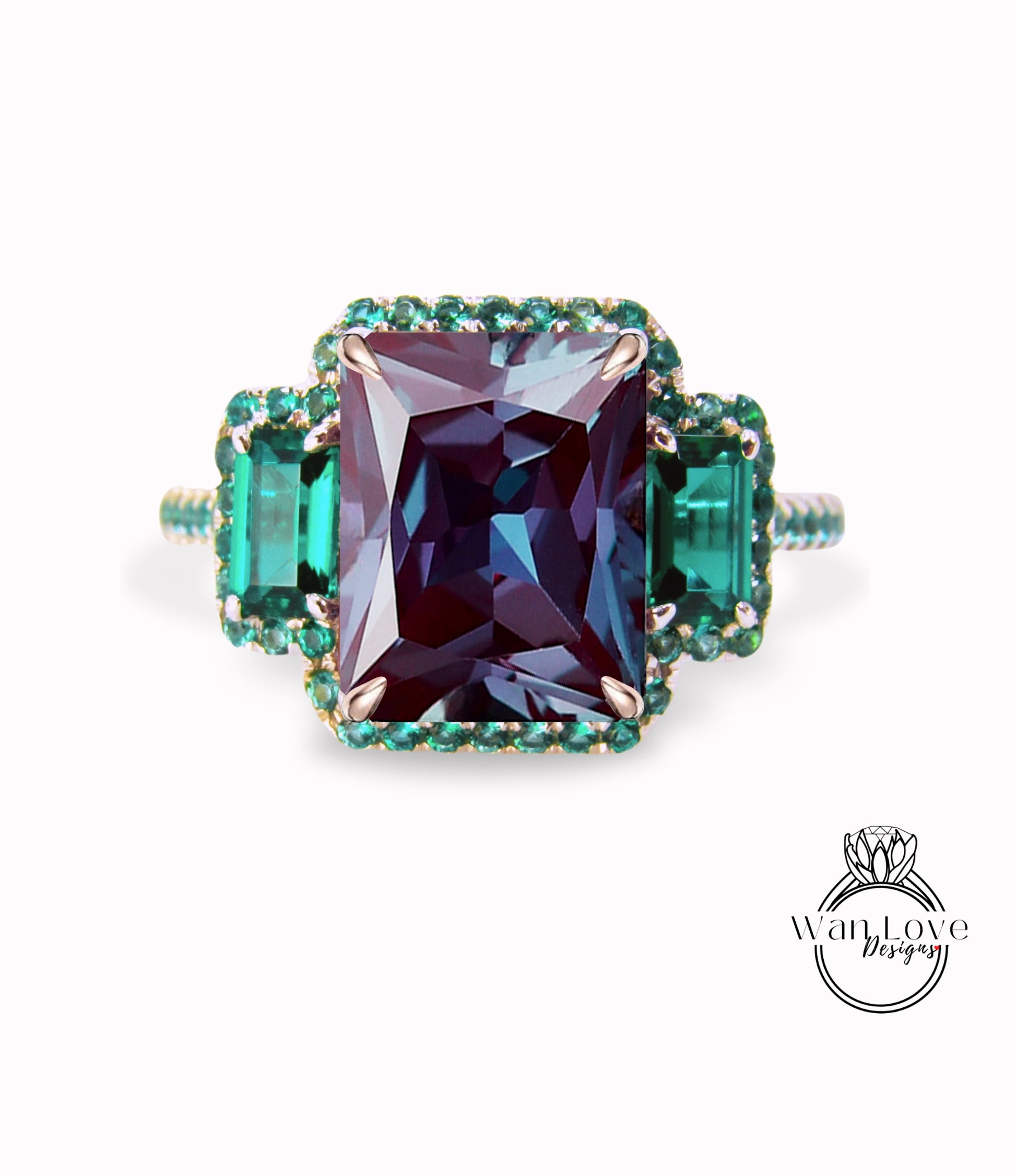 Anello di fidanzamento in pietra preziosa Alexandrite Emerald Green 3 Triple Halo da 4 ct, Anello Halo Baguette Smeraldo Alexandrite, Anello in oro 14k, Regalo di anniversario