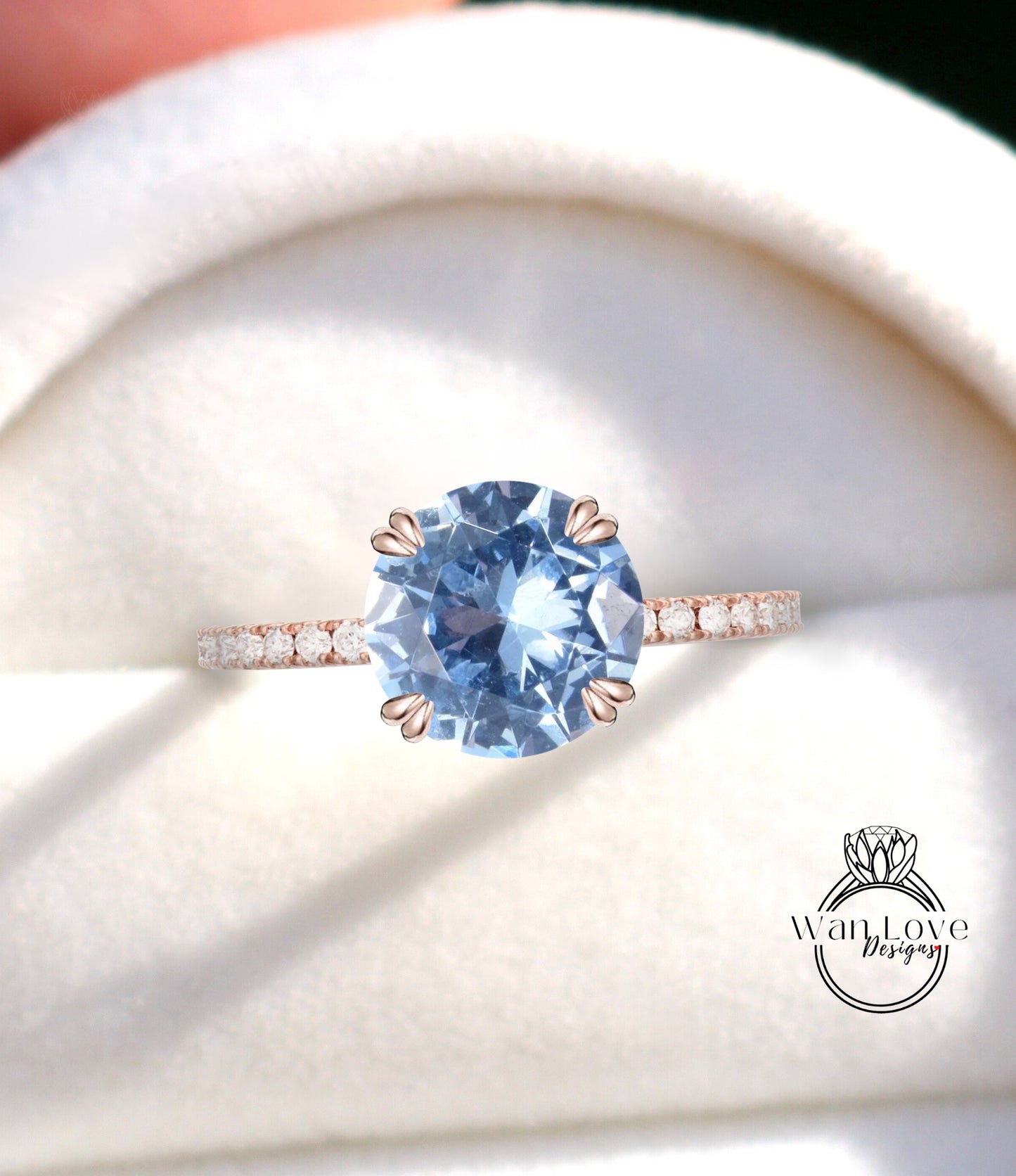 Anello di fidanzamento con spinello e diamante acquamarina, rotondo, cattedrale 14k 18k bianco giallo oro rosa-platino-su misura-anniversario di matrimonio