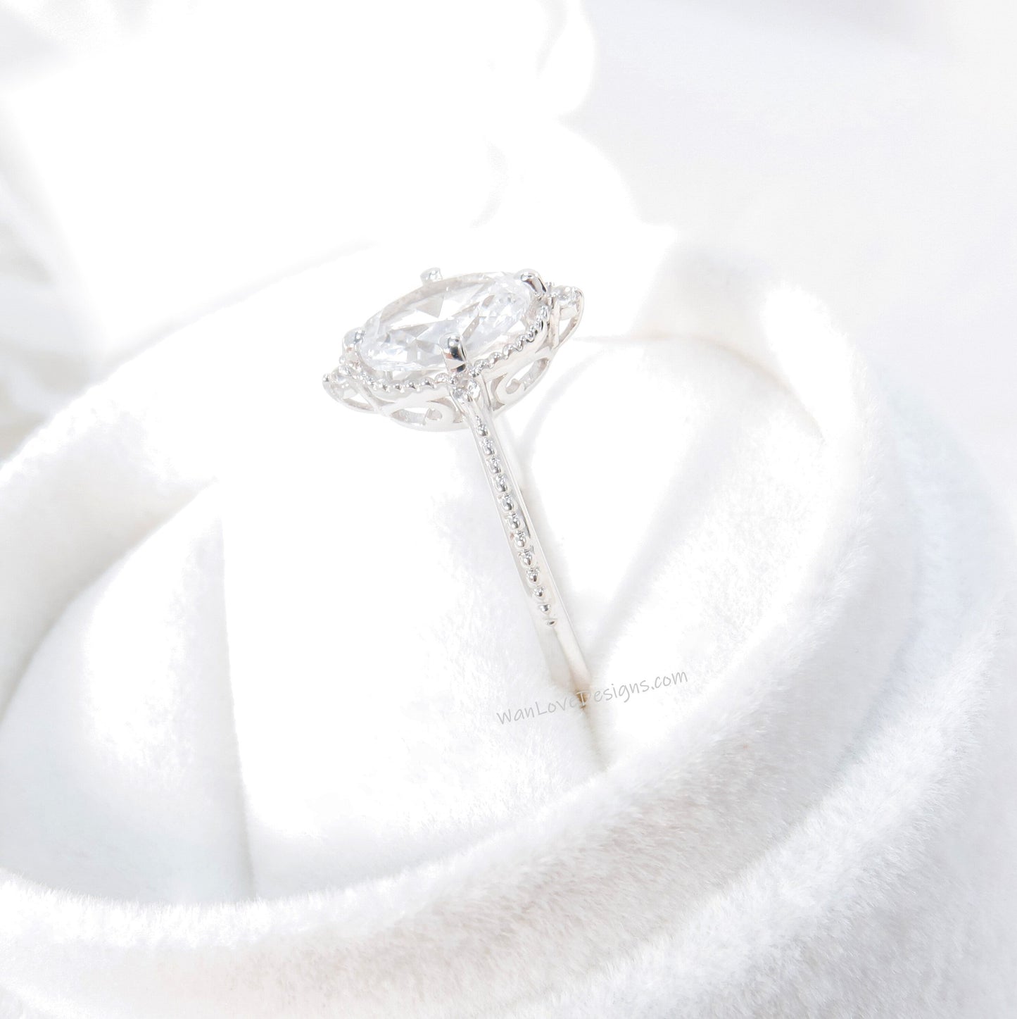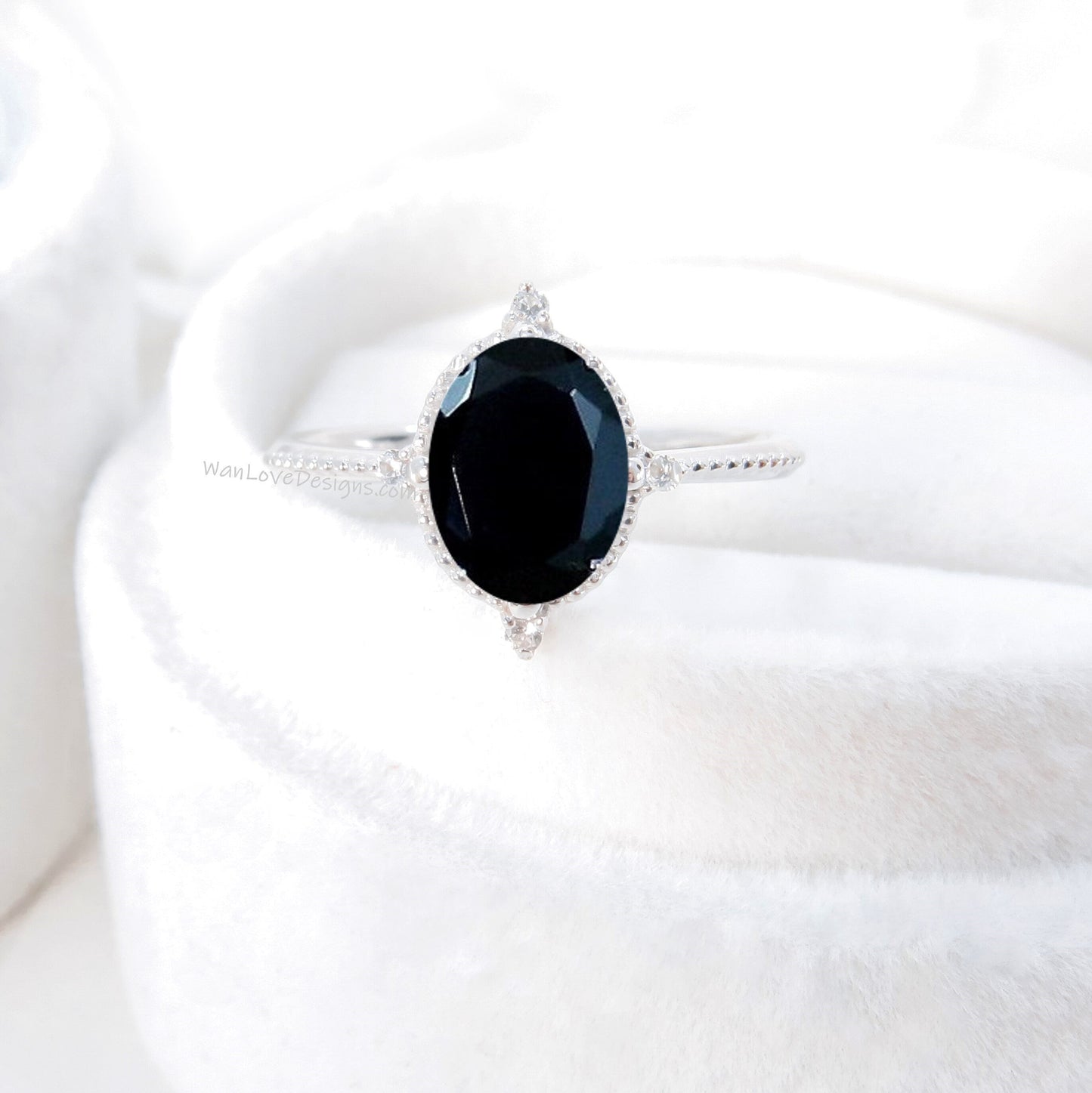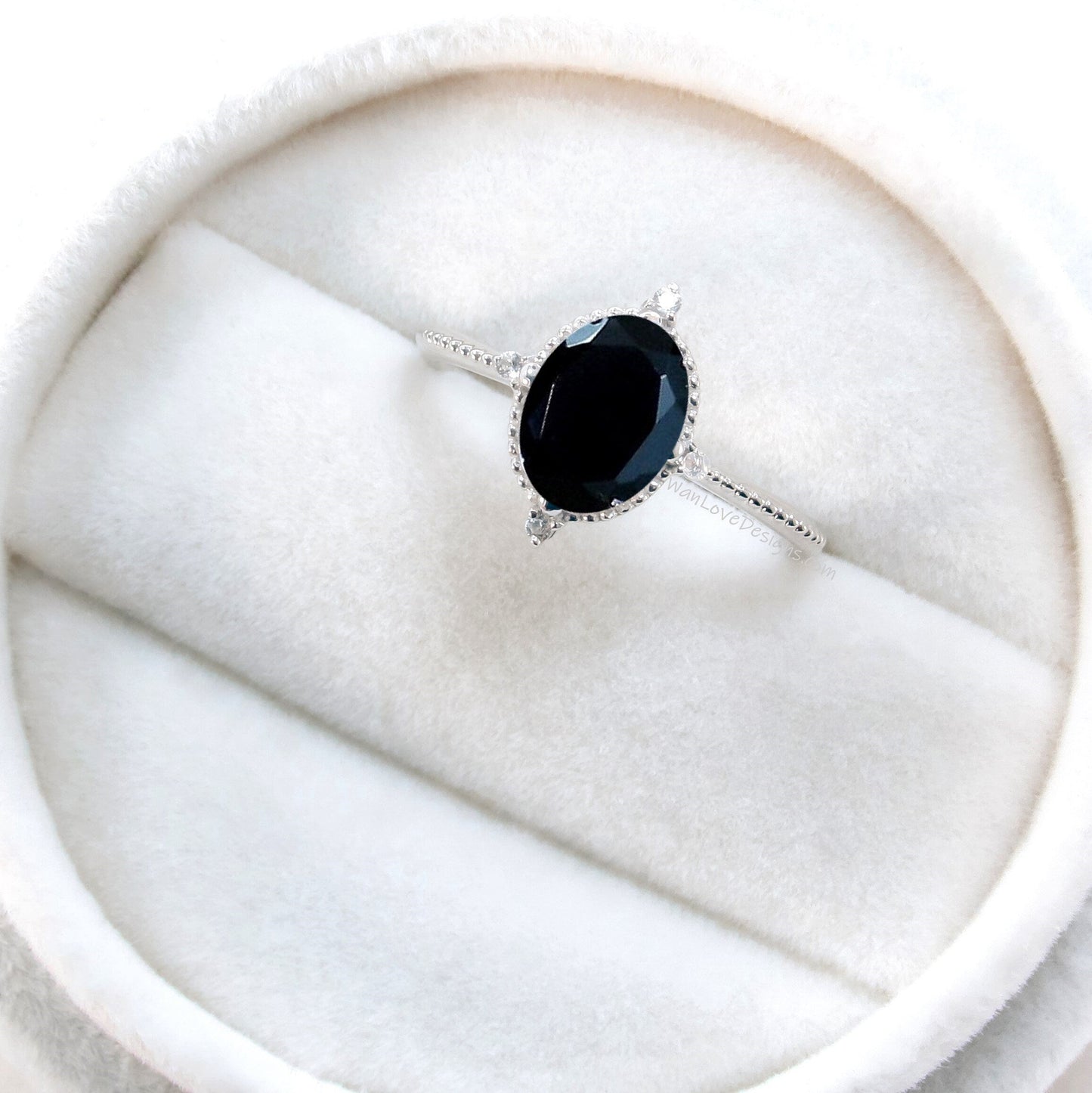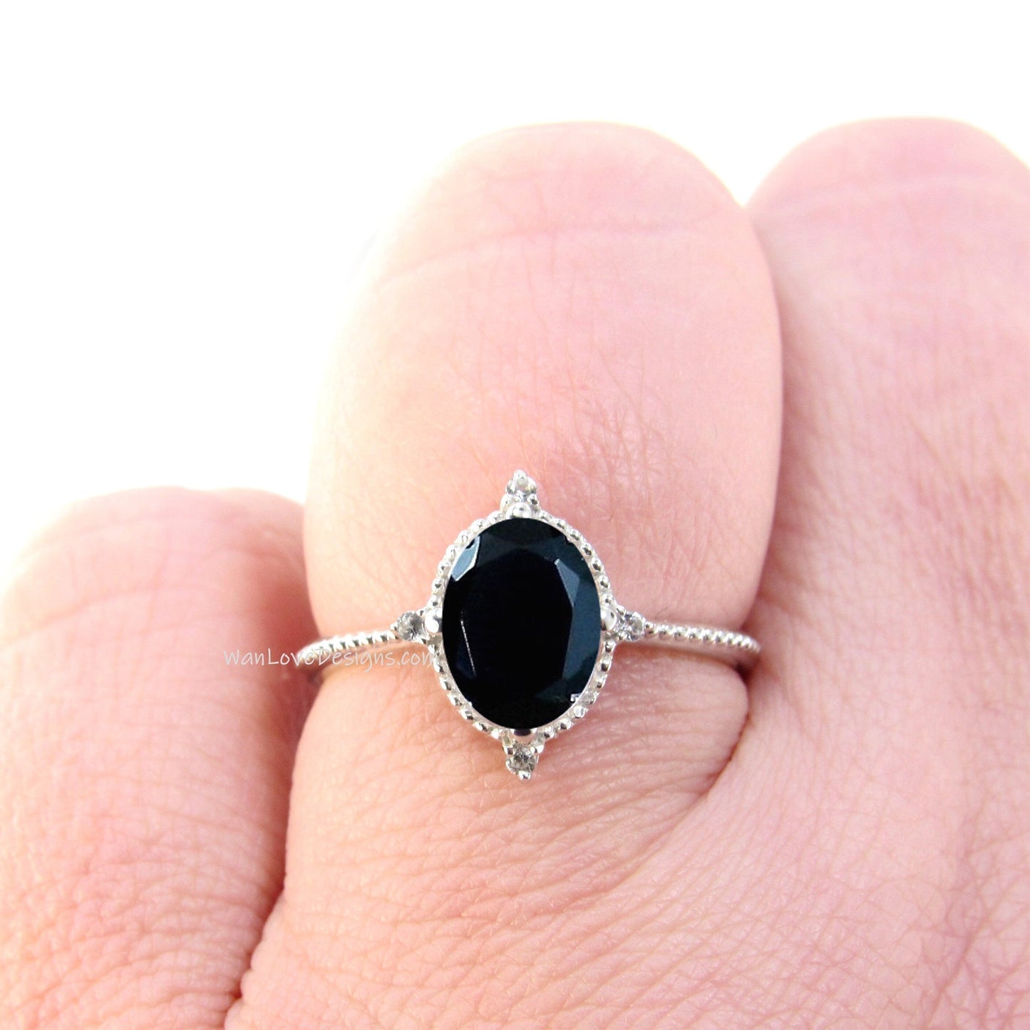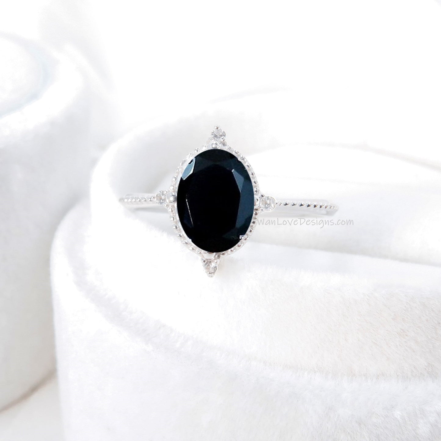 Anello di fidanzamento Milgrain ovale con diamante spinello nero Matrimonio personalizzato Stella polare, Oro 18kt 14kt, Platino, WanLoveDesigns