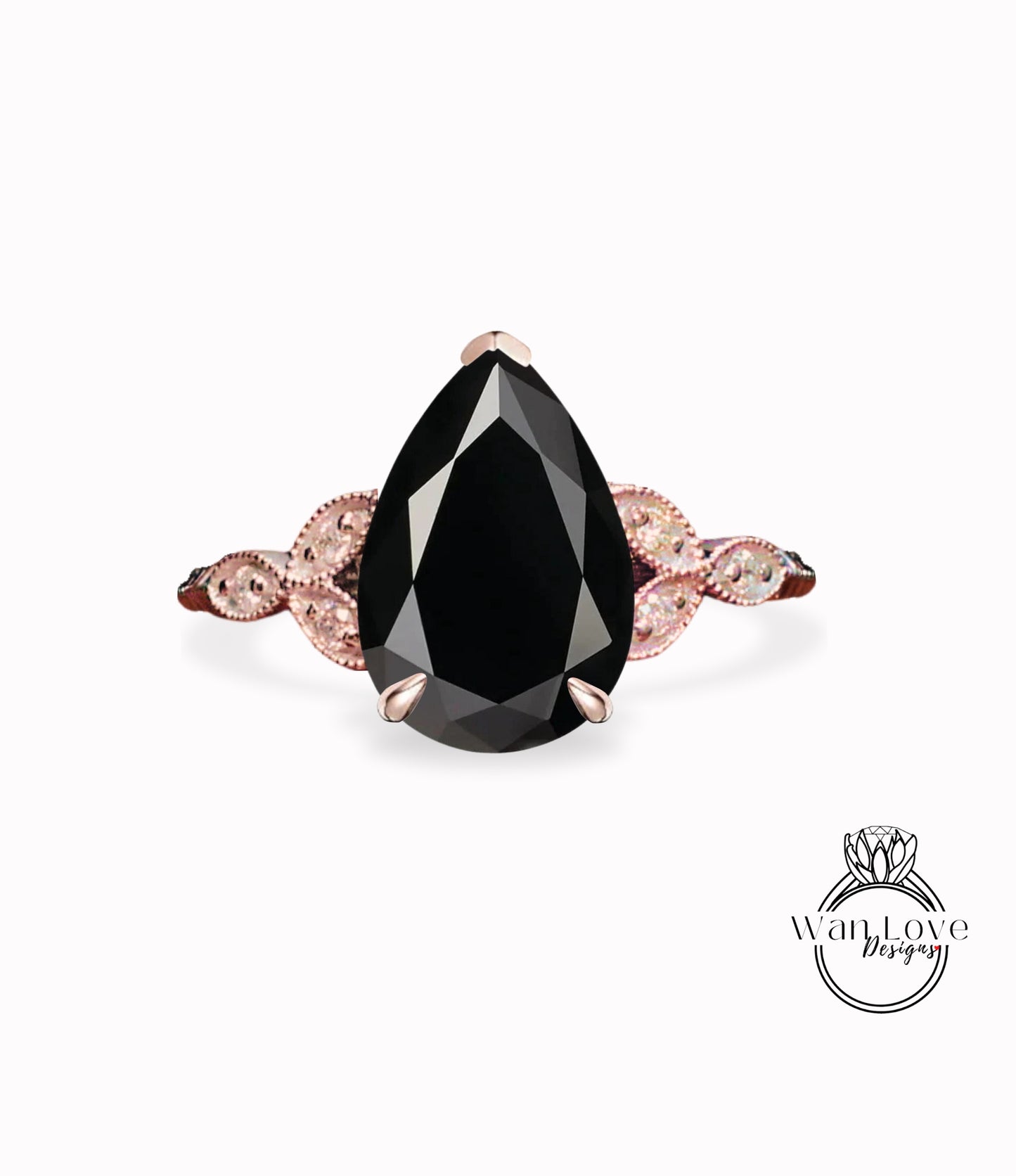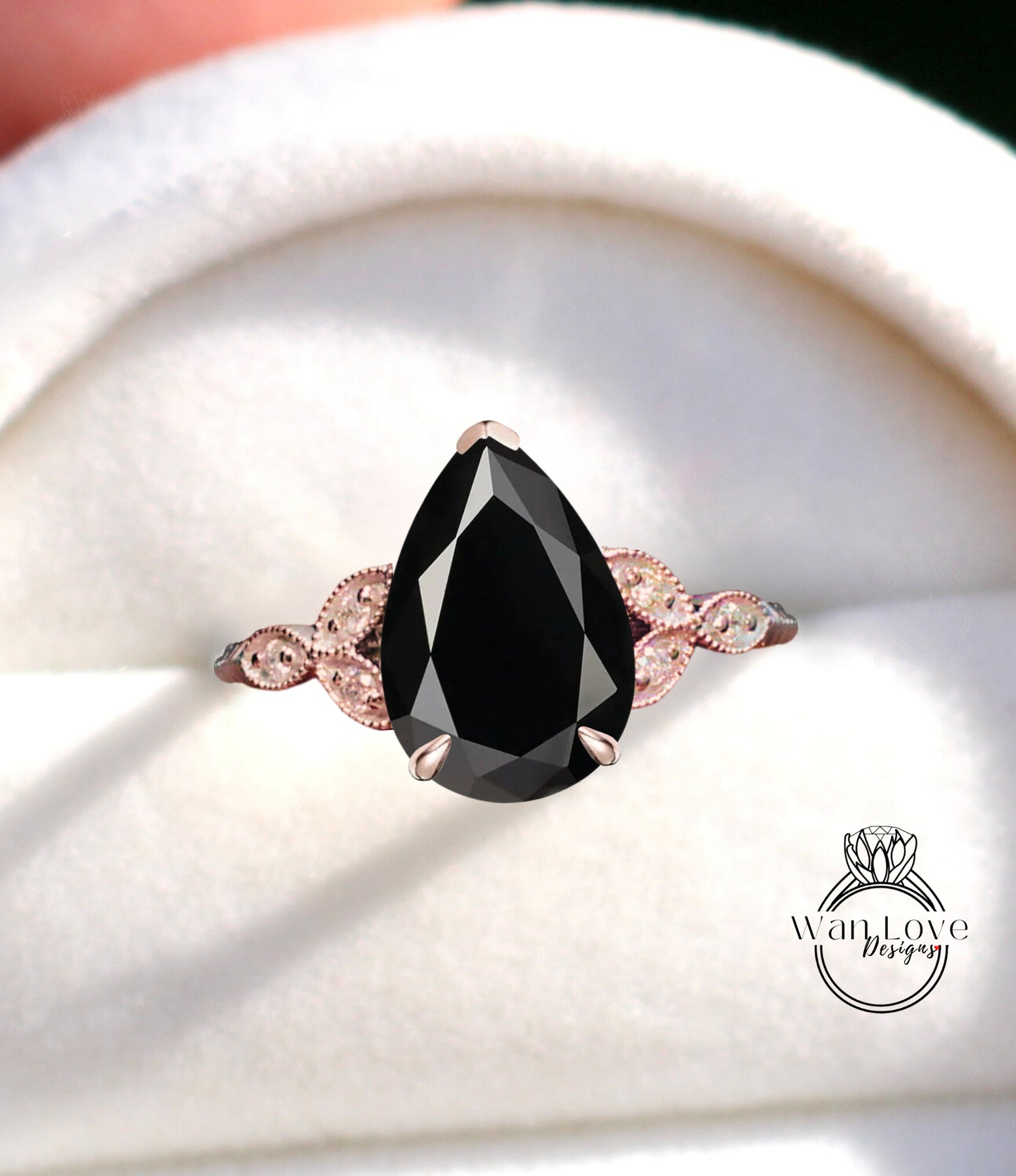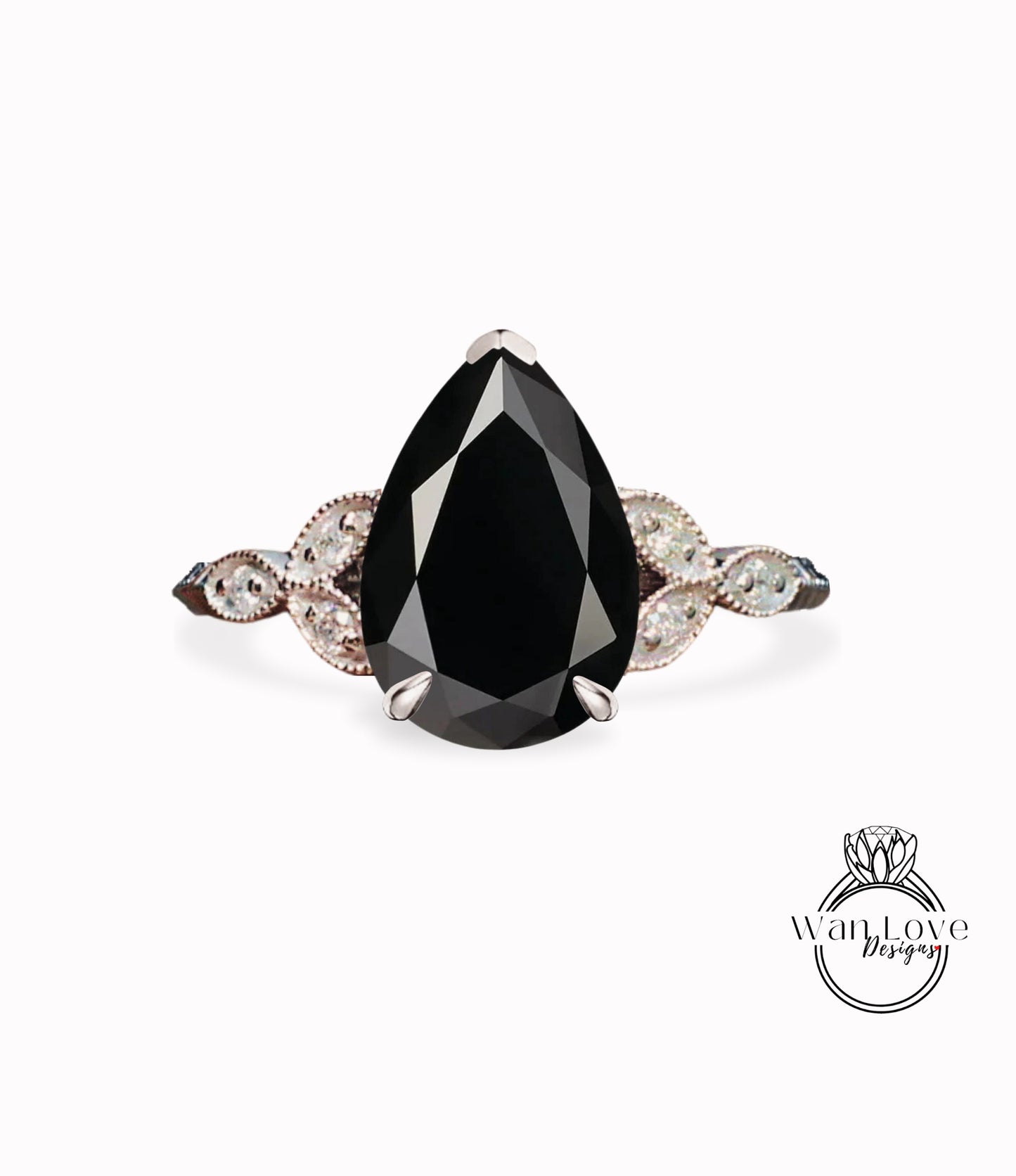 Anello di fidanzamento a grappolo antico con spinello nero e diamanti con foglia di pera inciso Milgrain o liscio 14kt oro 18kt platino matrimonio personalizzato