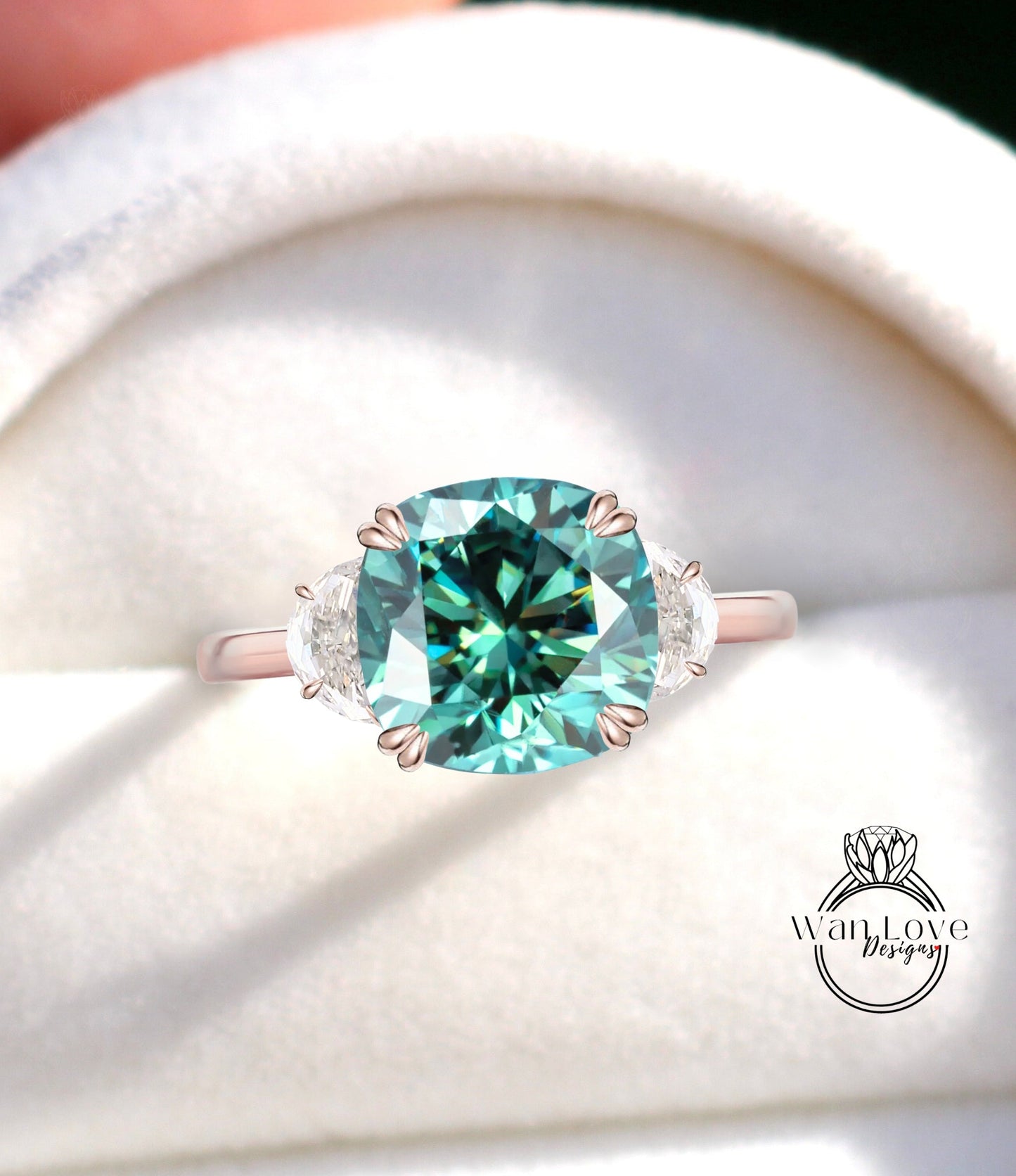 Anello di fidanzamento Moissanite verde blu con taglio a cuscino, anello di fidanzamento vintage con celebrità in oro, donna, 3 gemme, anello nuziale, regalo di anniversario.
