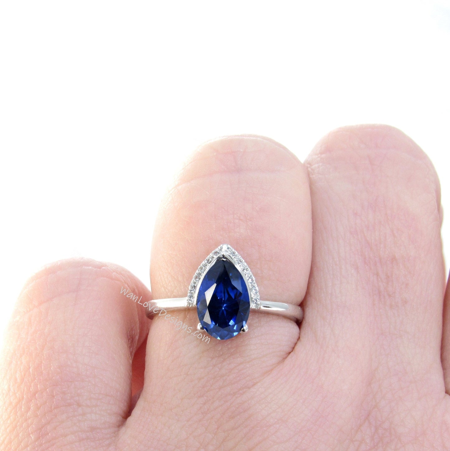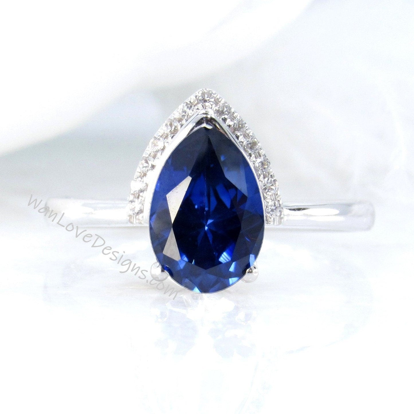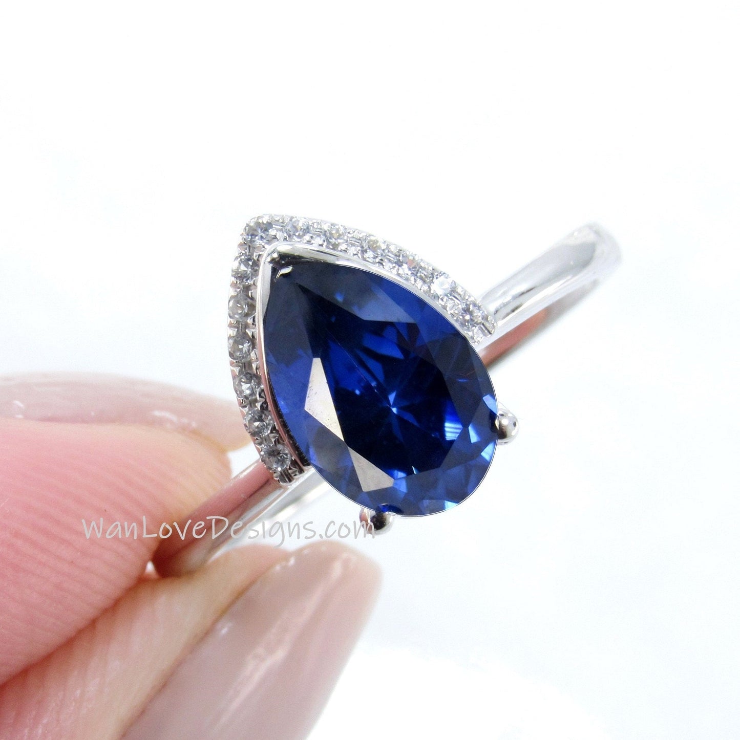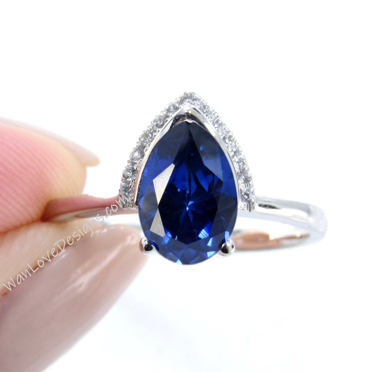 Anello di fidanzamento unico con zaffiro blu, pietra portafortuna, diamante, pera, moderno, semilunetta, mezzaluna, personalizzato, WanLoveDesigns
