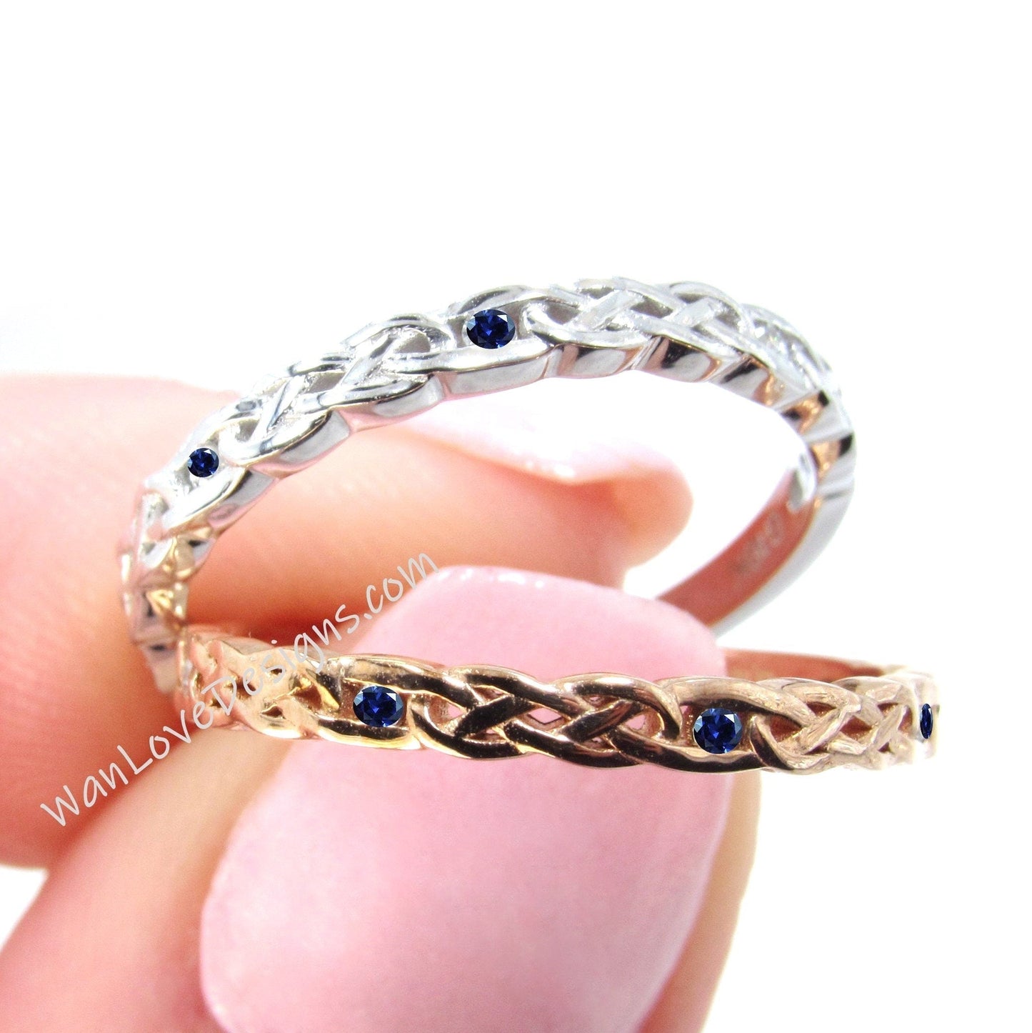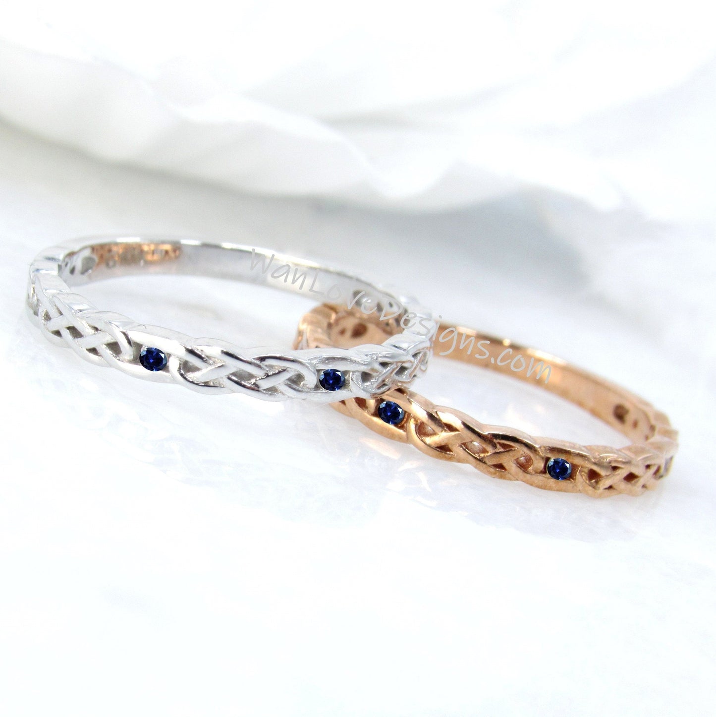 Anello nuziale intrecciato con nodo celtico e zaffiro blu, quasi eternità, anello coordinato impilabile, regalo di anniversario per le donne, fascia infinita in oro rosa 14k