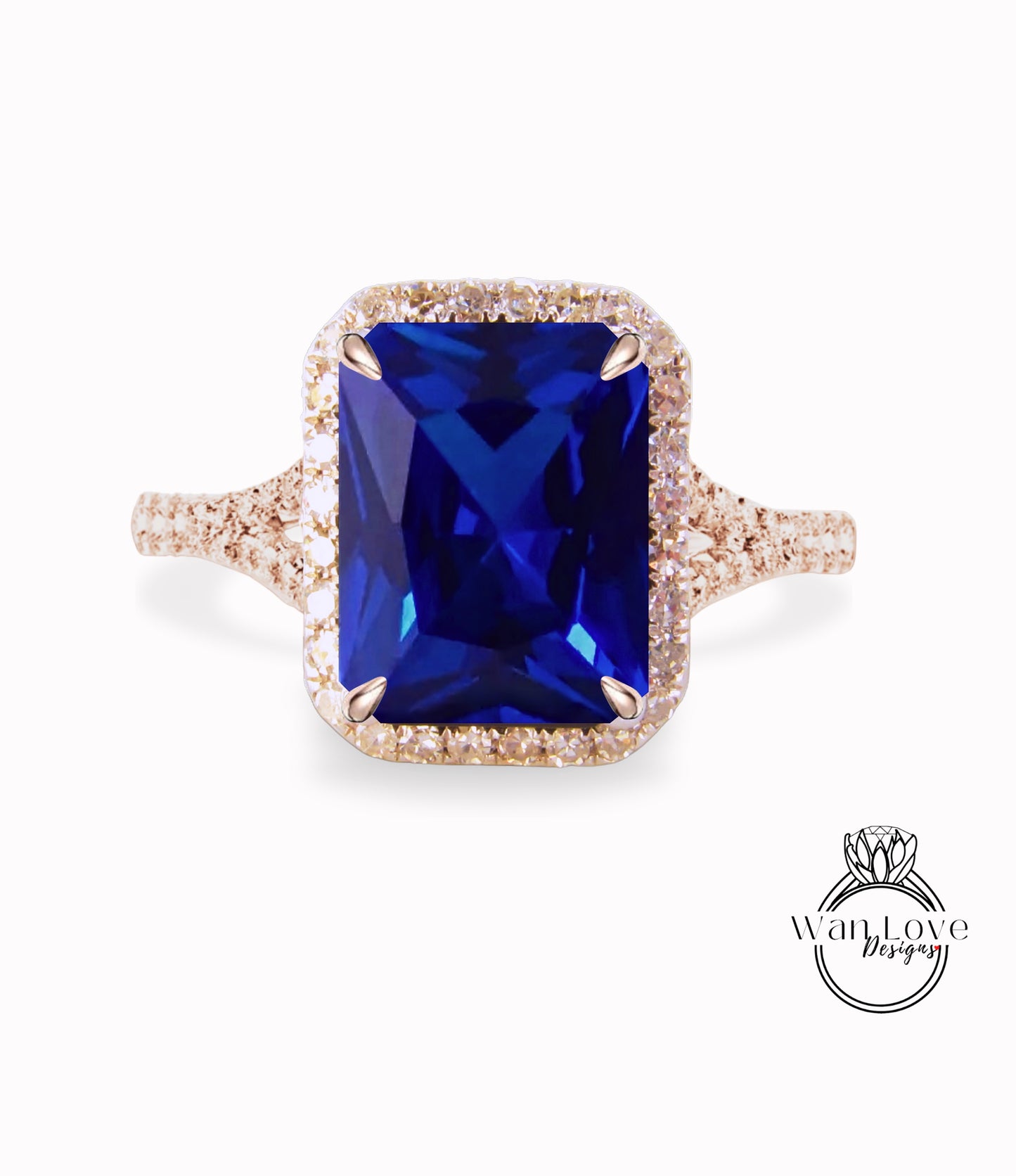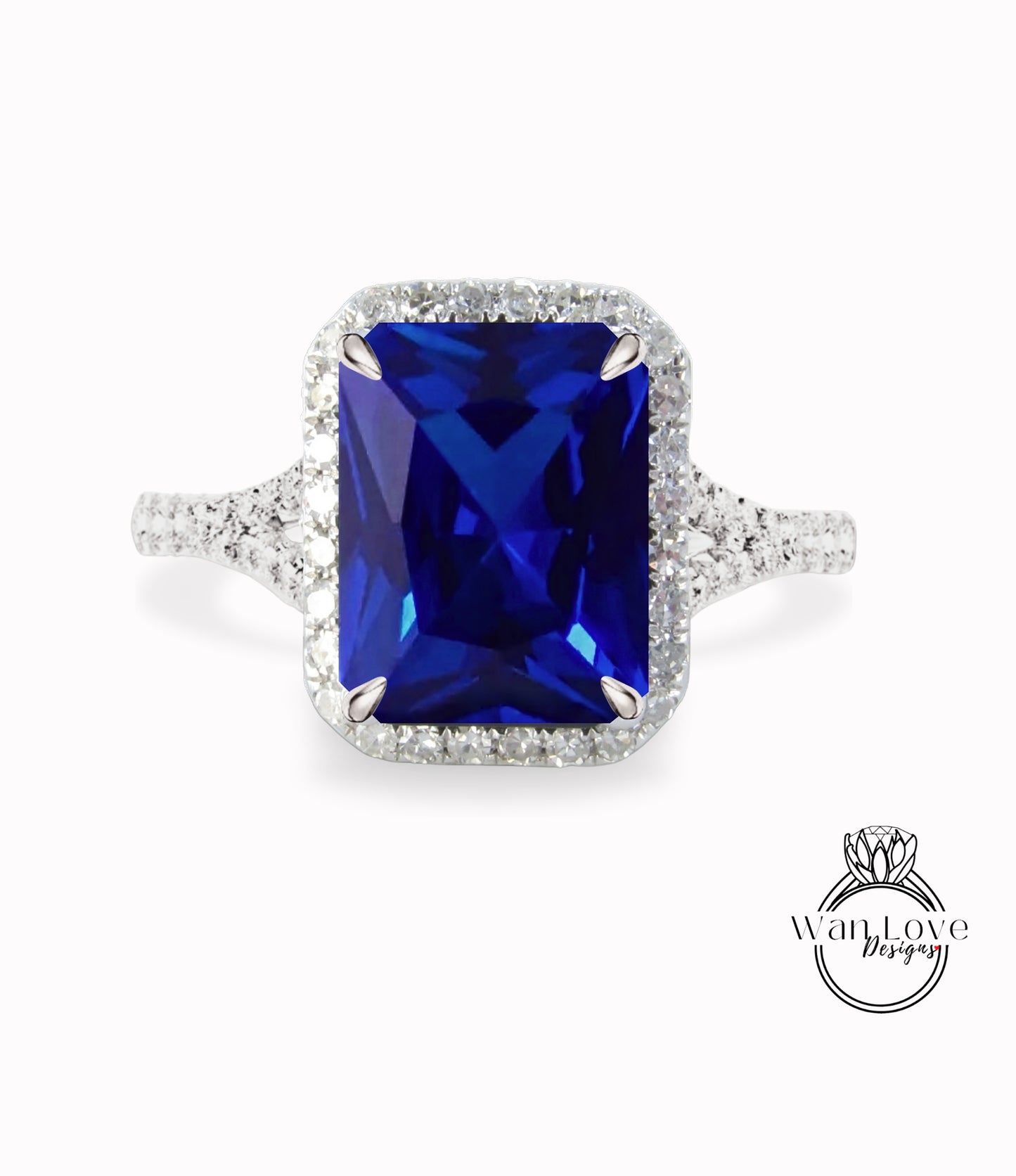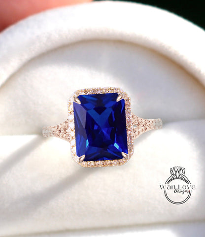 Anello di fidanzamento con punte di cesto di Halo laterale smeraldo con diamanti in zaffiro blu, anello cuscino allungato, personalizzato, matrimonio, anniversario
