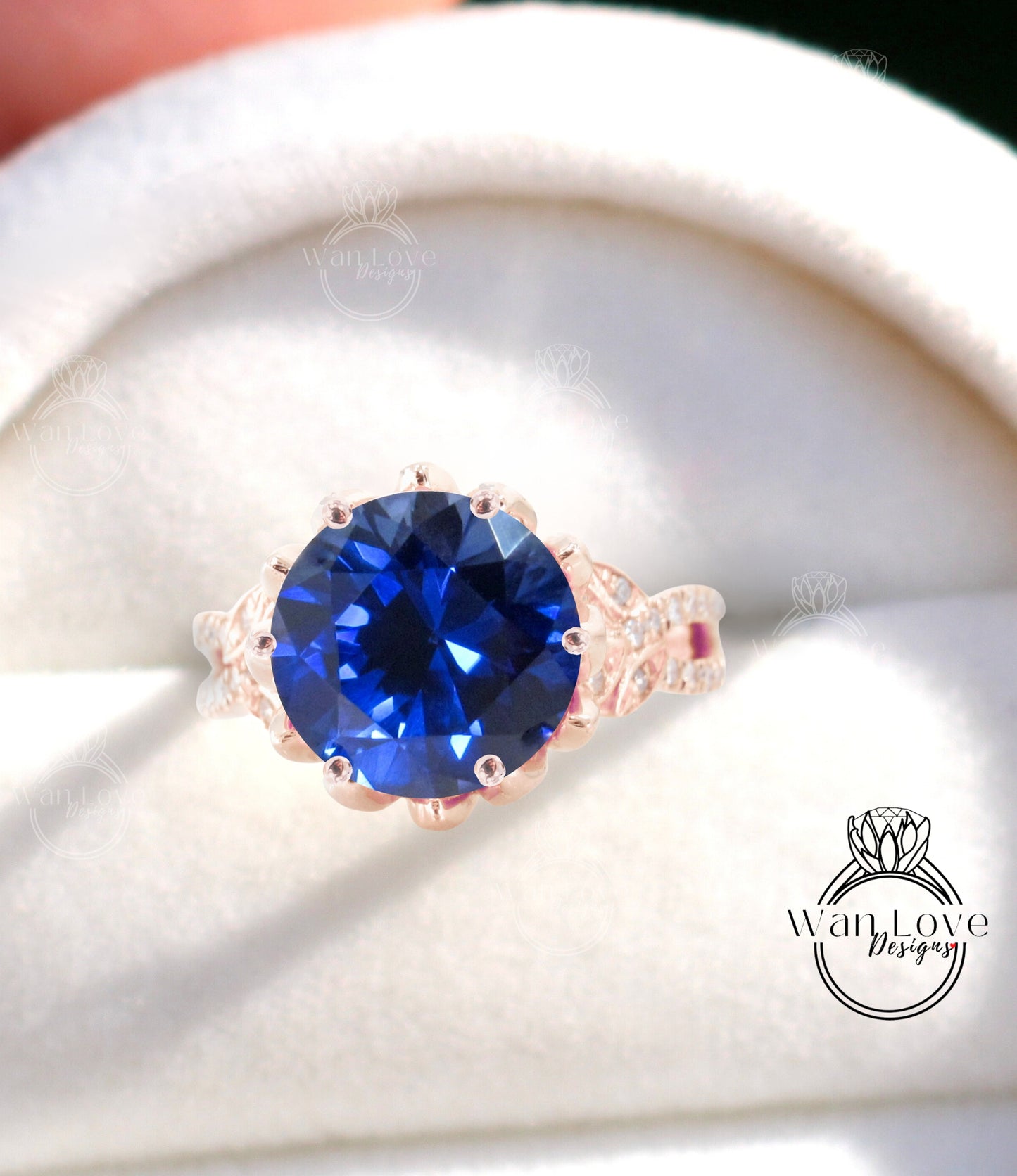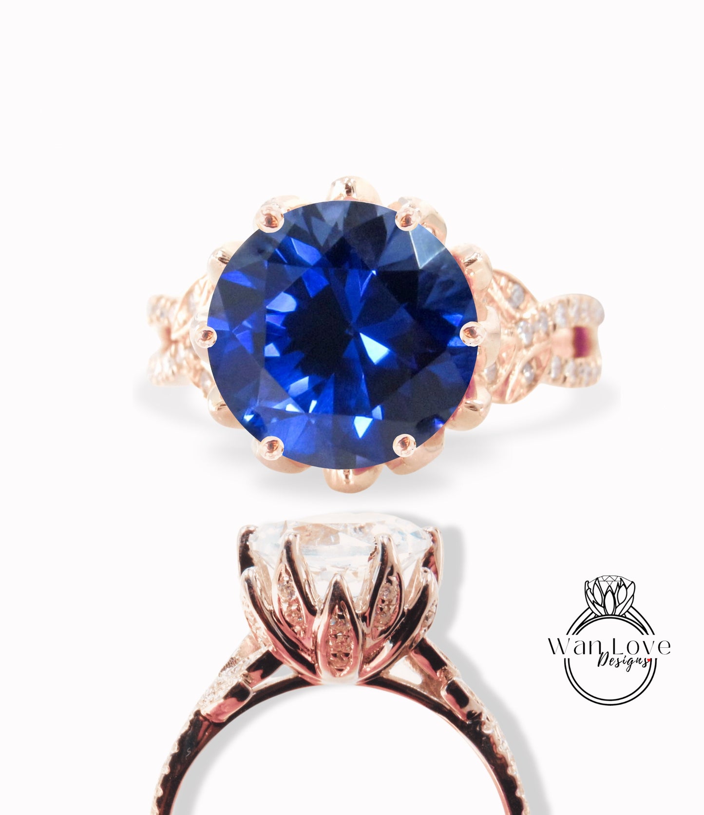 Anello di fidanzamento con foglia con gambo diviso e fiore di loto con zaffiro blu e diamante, oro rosa giallo bianco 14k 18k, platino, personalizzato, matrimonio, regalo