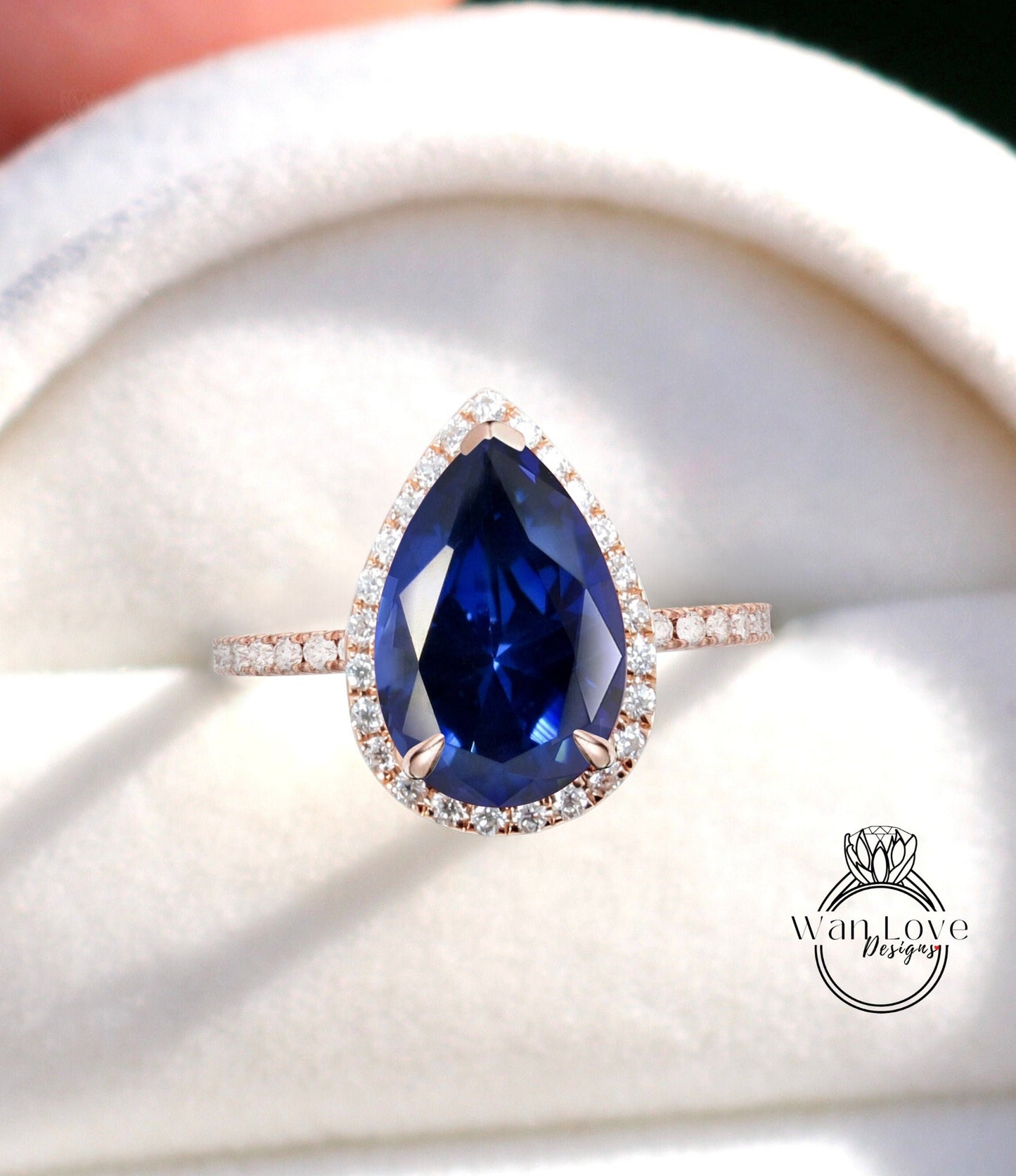Anello di fidanzamento vintage a forma di pera con zaffiro blu, anello a forma di pera con diamante in oro rosa 14k, anello per proposta di anello di anniversario di matrimonio.