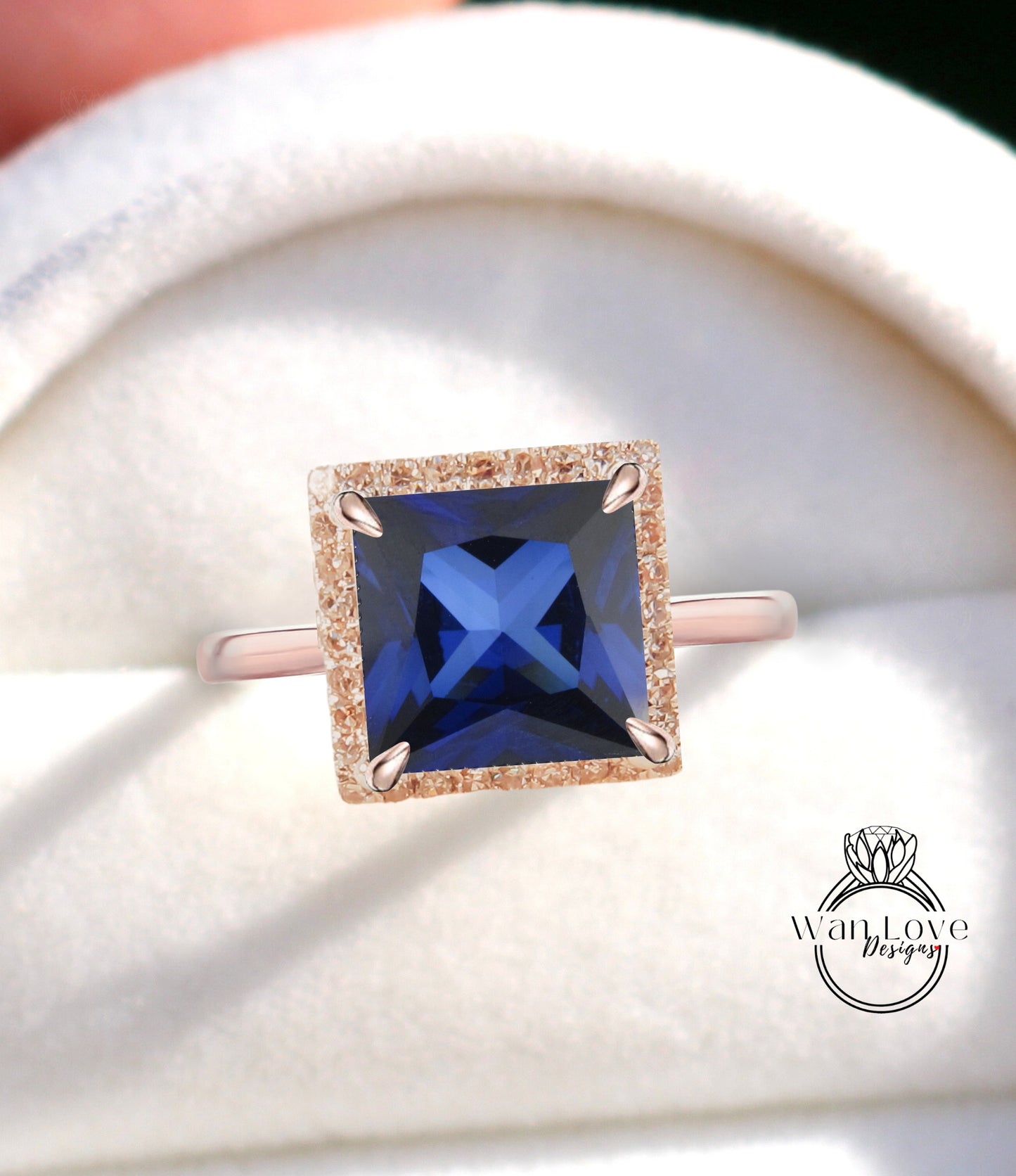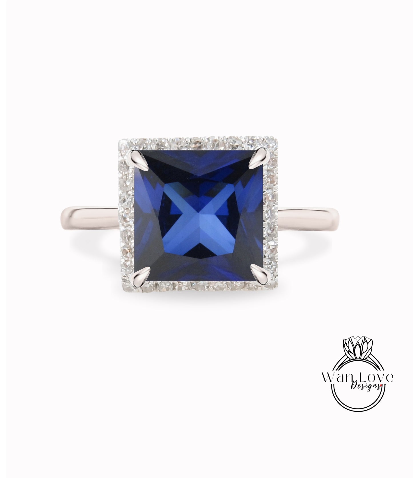 Anello di fidanzamento Princess Halo con zaffiro blu e diamanti, con gambo semplice, cattedrale, in oro 14k, 18k, platino, quadrato nuziale, WanLoveDesigns