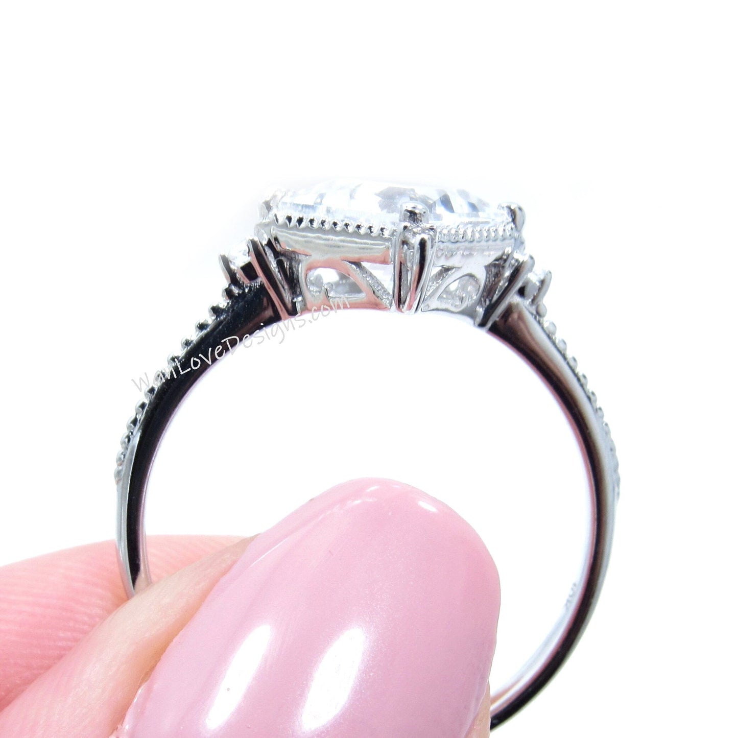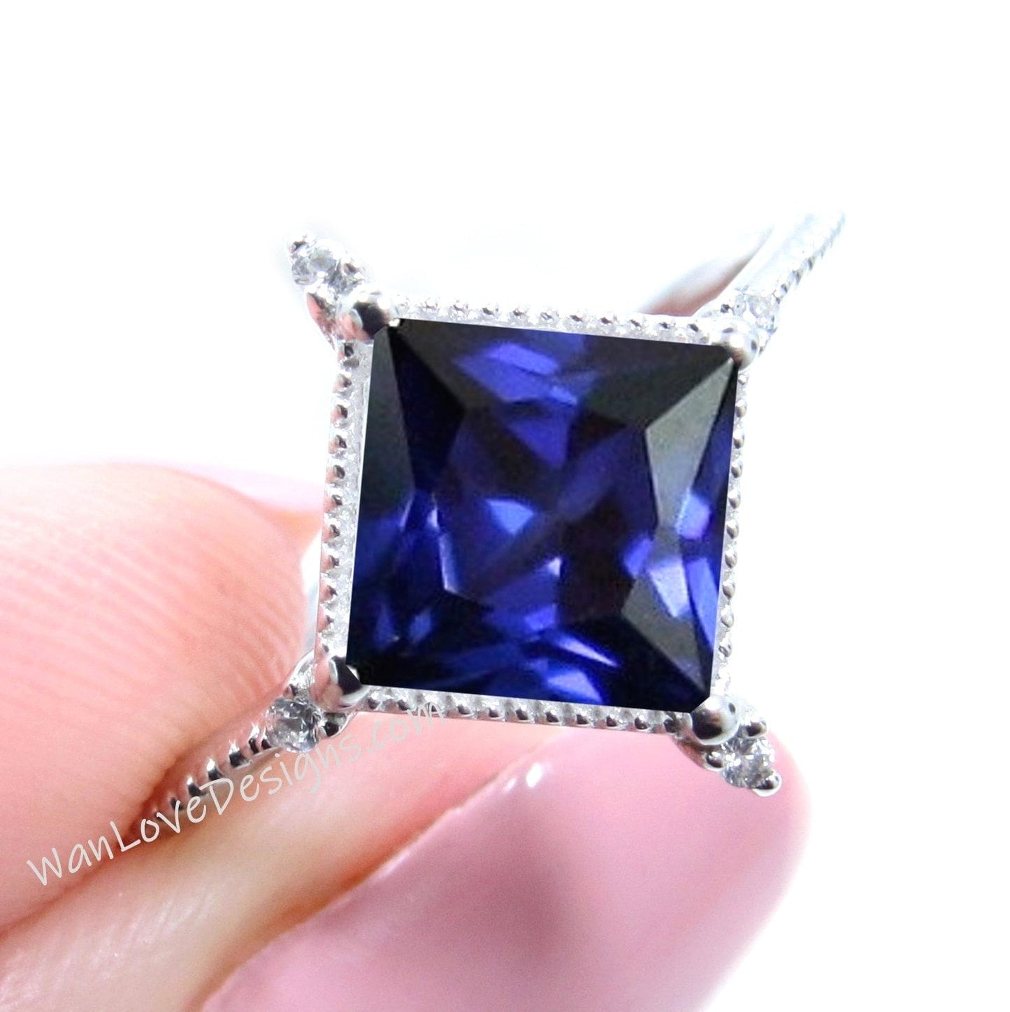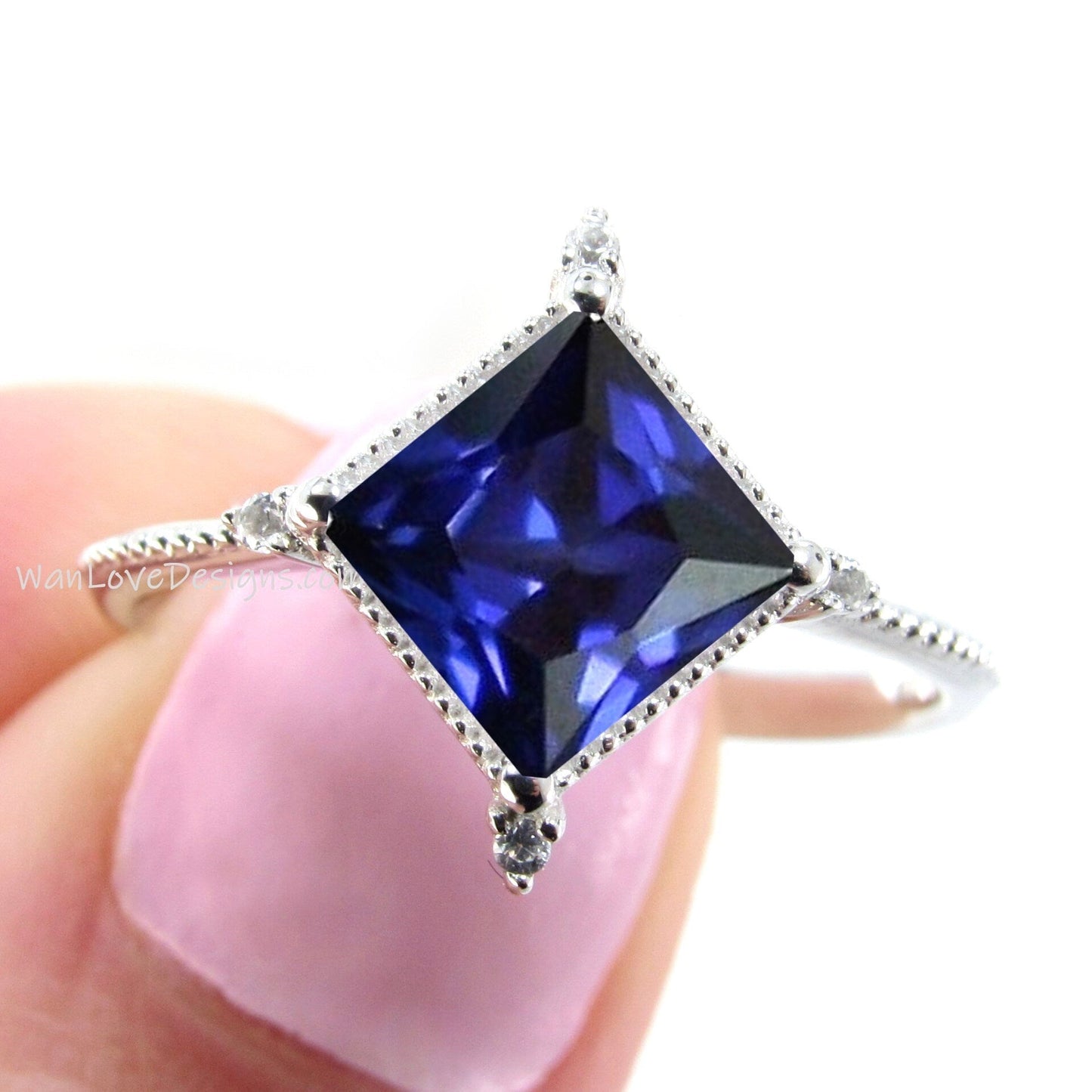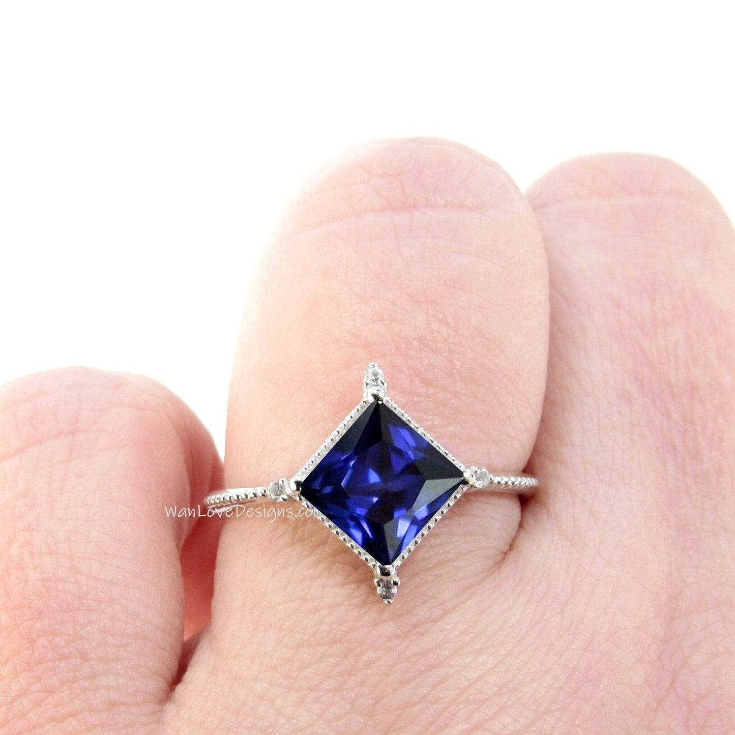 Anello di fidanzamento principessa Milgrain Kite NSEW con zaffiro blu e diamanti Matrimonio personalizzato