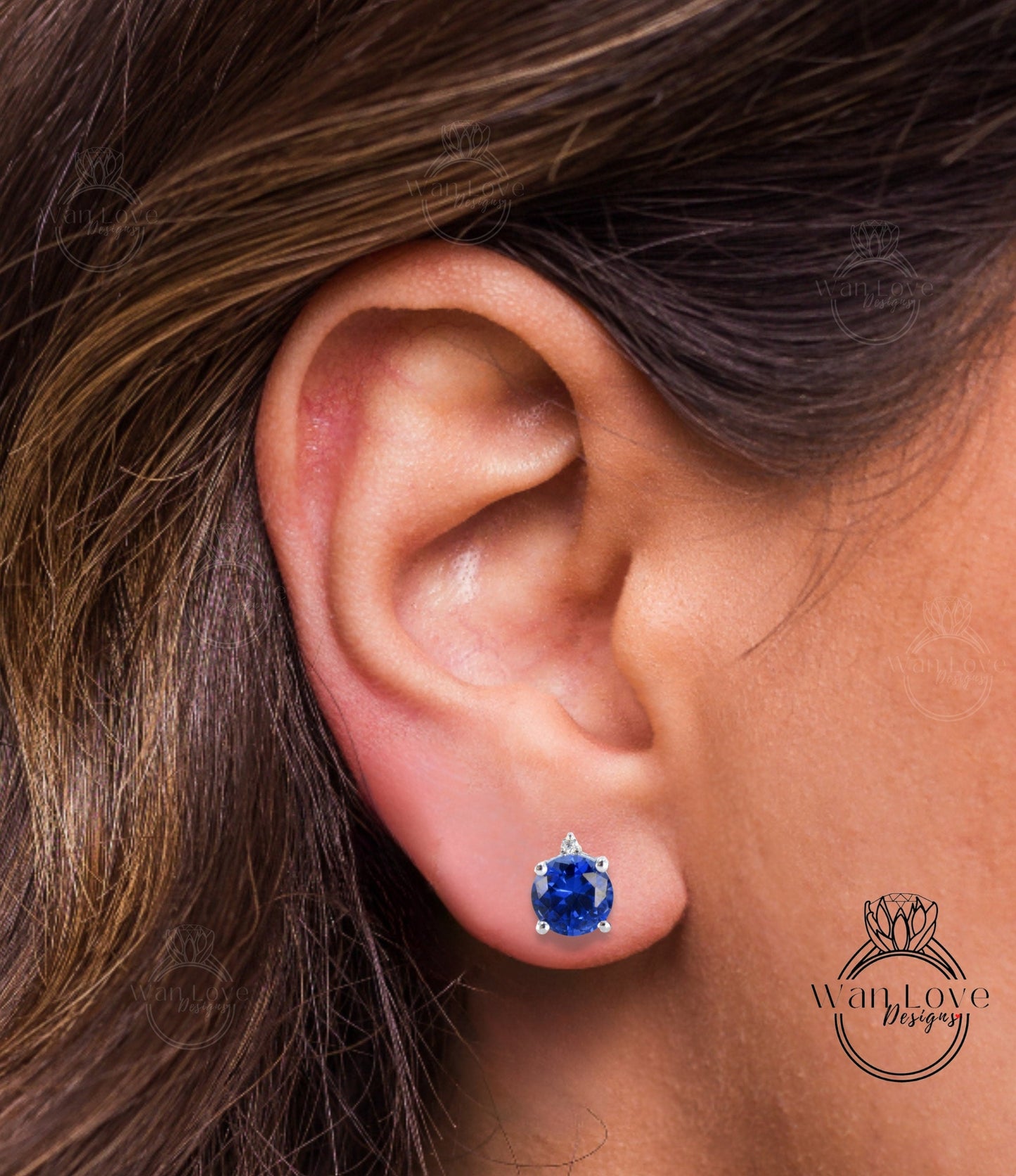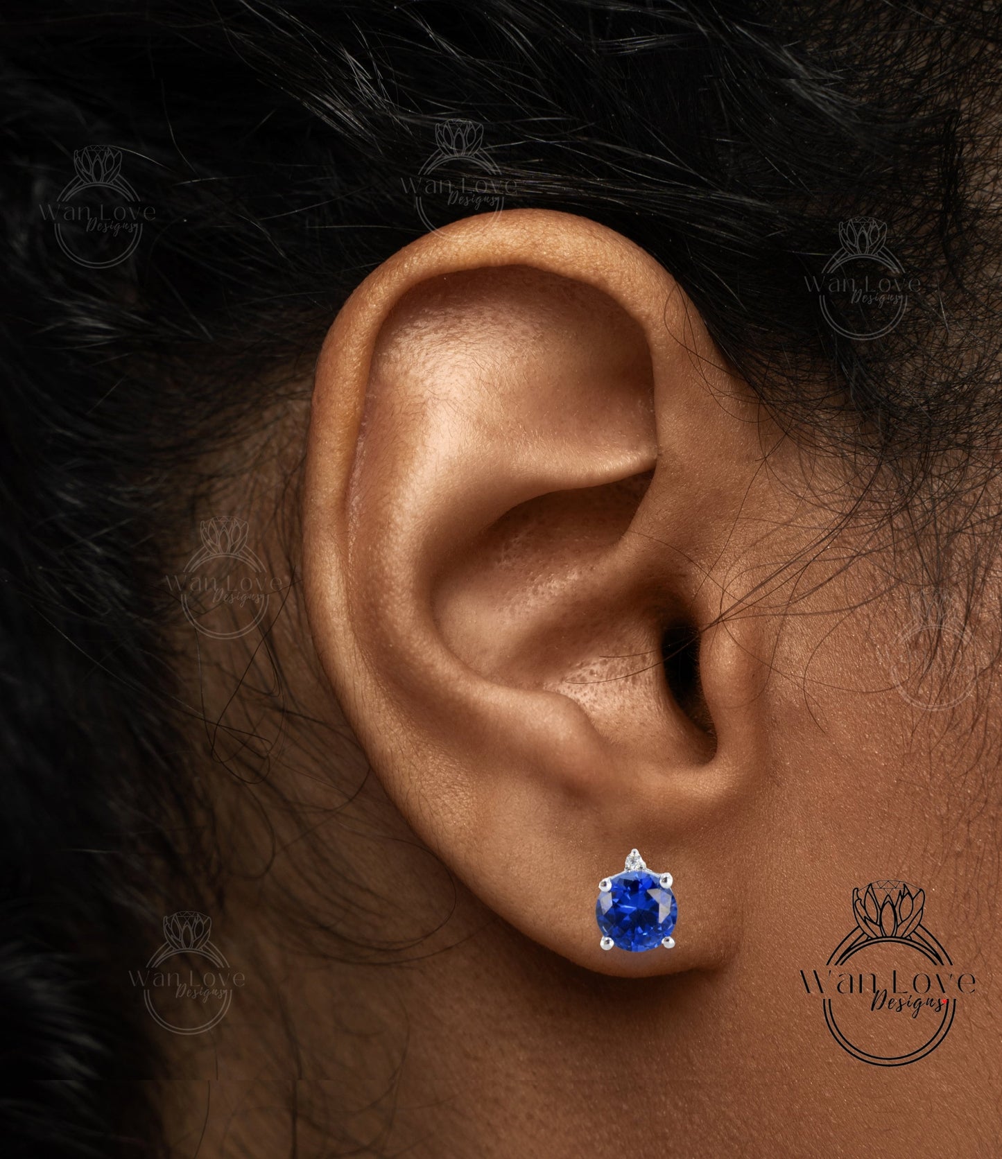 Orecchino a perno rotondo con zaffiro blu e moissanite a vite, reggispinta, 4 poli, 1 ct ciascuno, 2 cttw, personalizzato, oro bianco, regalo di anniversario, pronto per la spedizione.