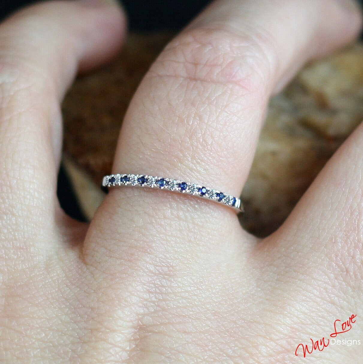 Anello impilabile con diamante sottile zaffiro blu, anello minimalista, fede nuziale in zaffiro oro 14k, fede nuziale Half Eternity, anello portafortuna della madre