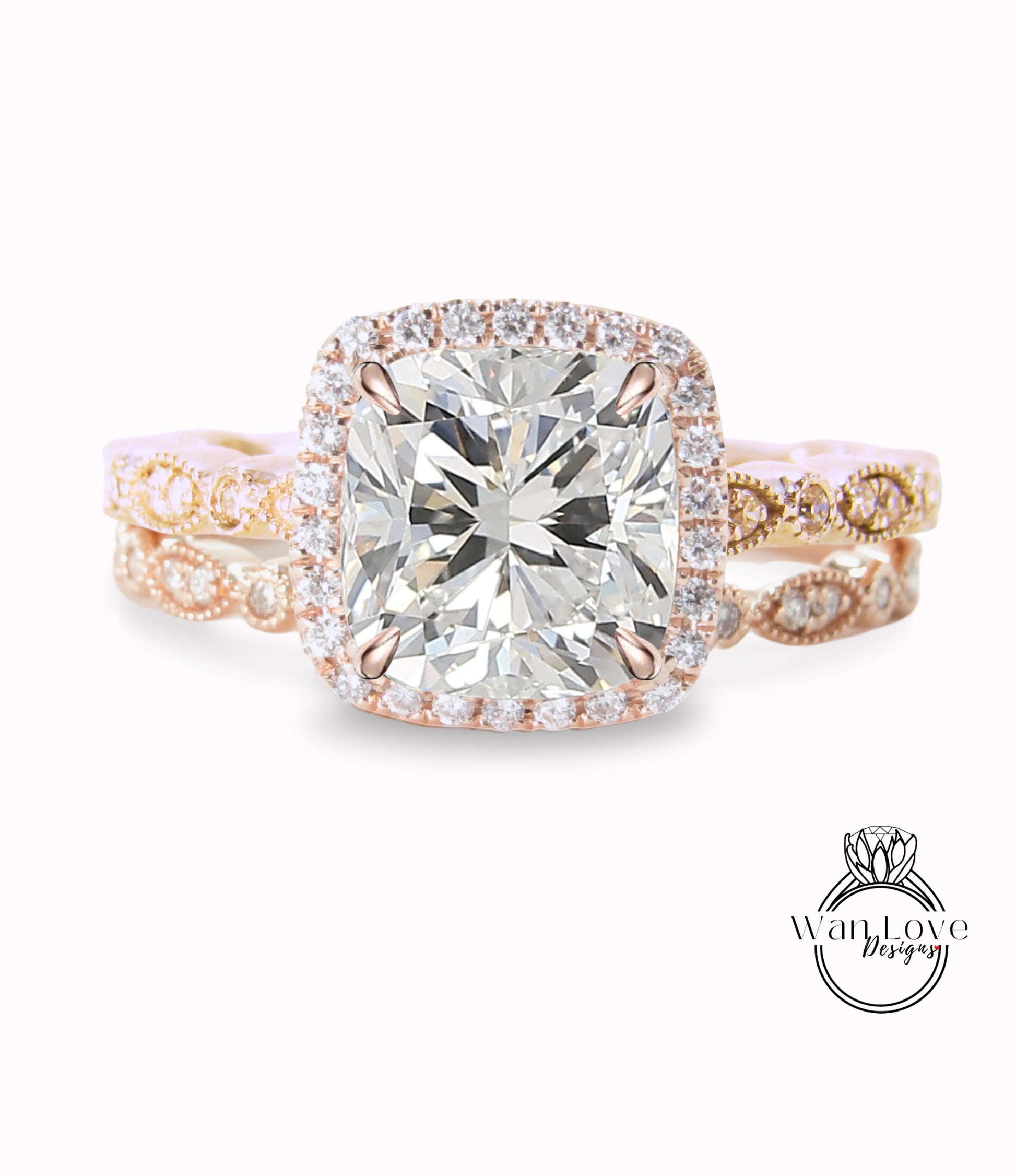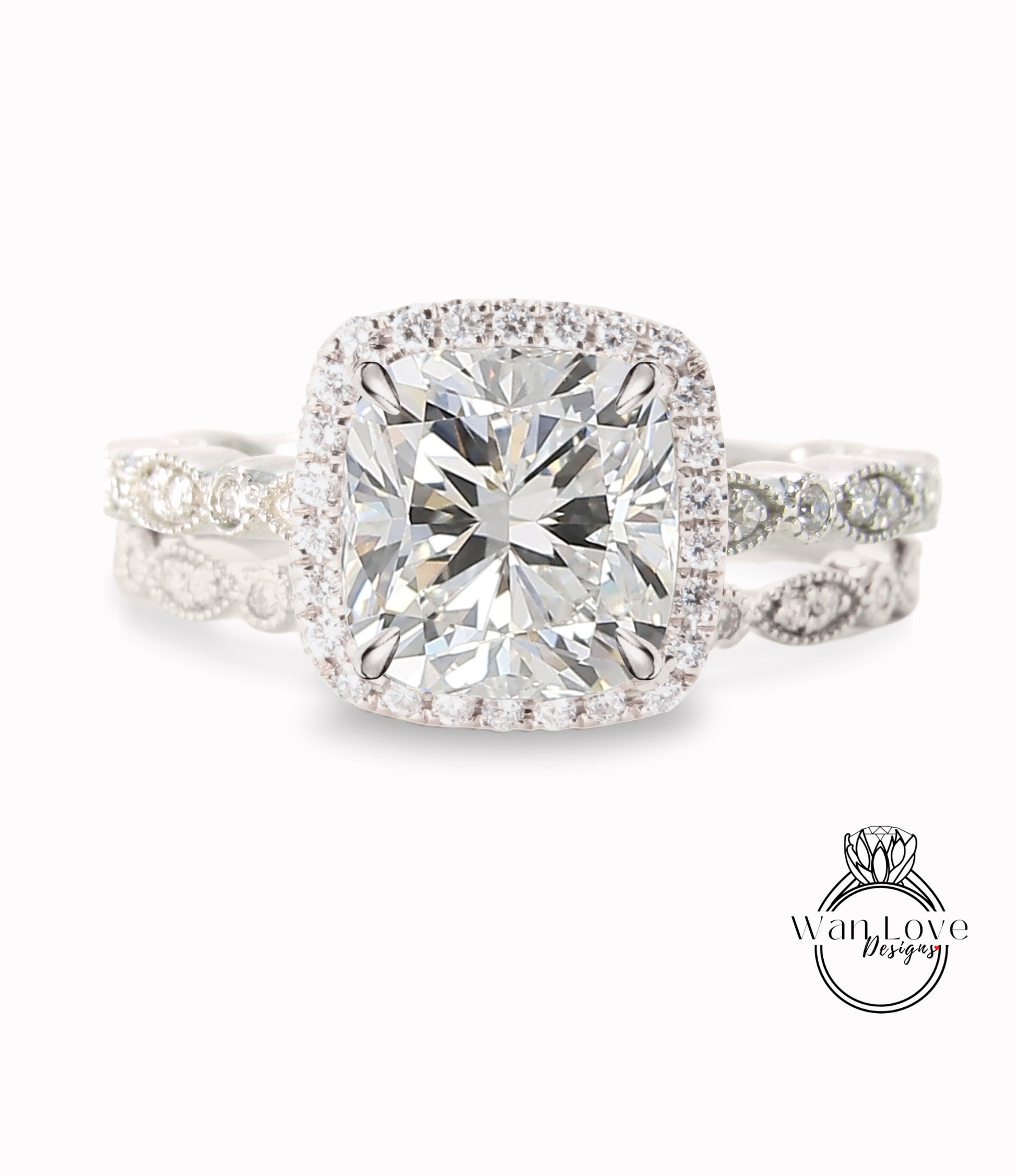 Cuscino di diamanti Anello di fidanzamento con foglia Milgrain Set di fedi nuziali IGI CVD HPHT Lab Diamanti personalizzati, 14k 18k Bianco Giallo Oro rosa-Platino
