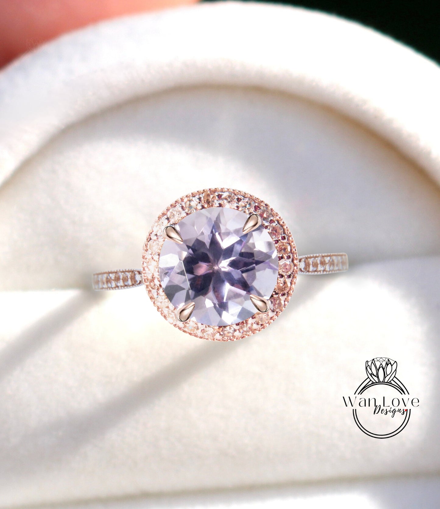 Anello d'oro con ametista diamante Halo / Anello centrale rotondo con ametista lavanda / Anello di fidanzamento / Anello anniversario / Anello di promessa / Anello Halo Milgrain