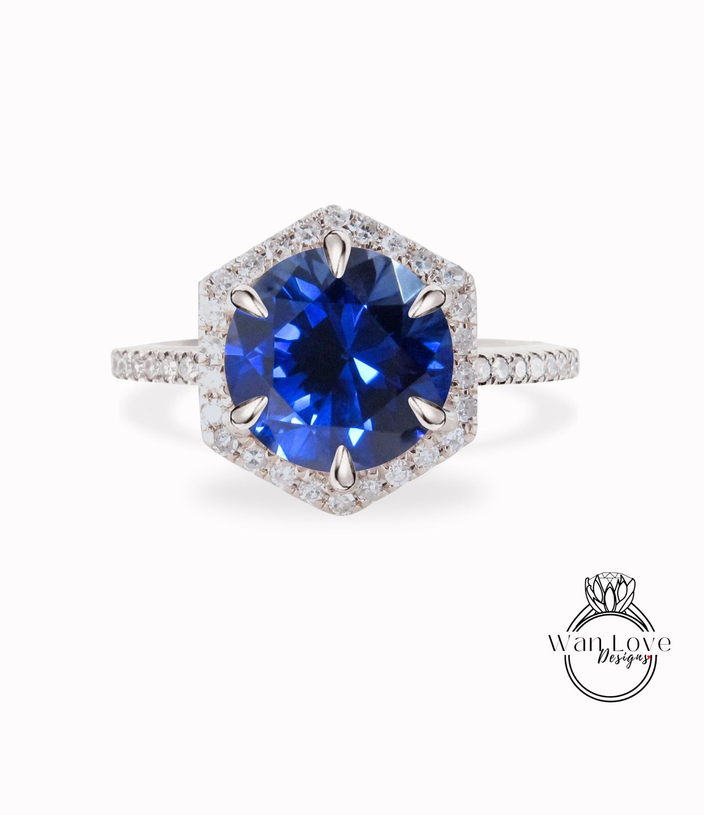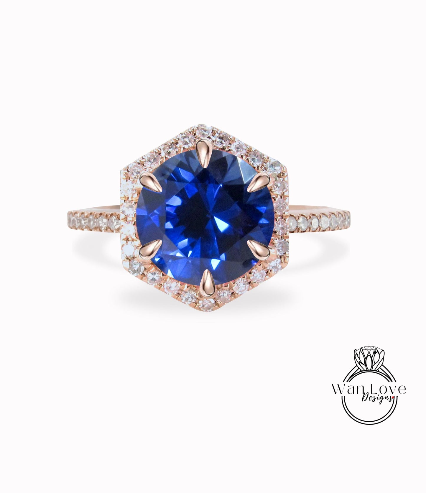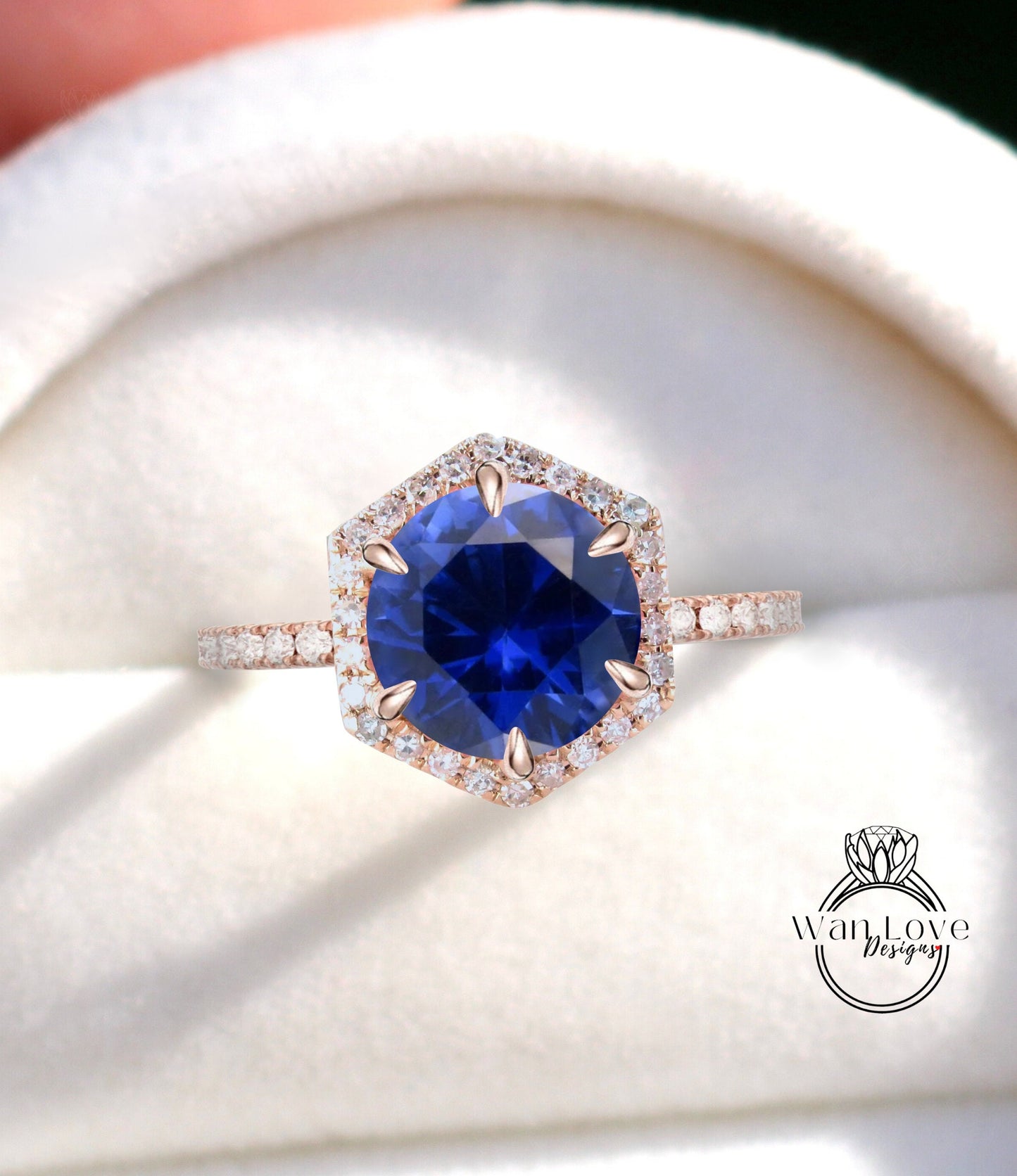 Anello Halo con diamante esagonale Anello con diamante blu zaffiro taglio rotondo Anello di fidanzamento Anello Art Déco in oro rosa vintage Halo Anello da sposa con promessa nuziale