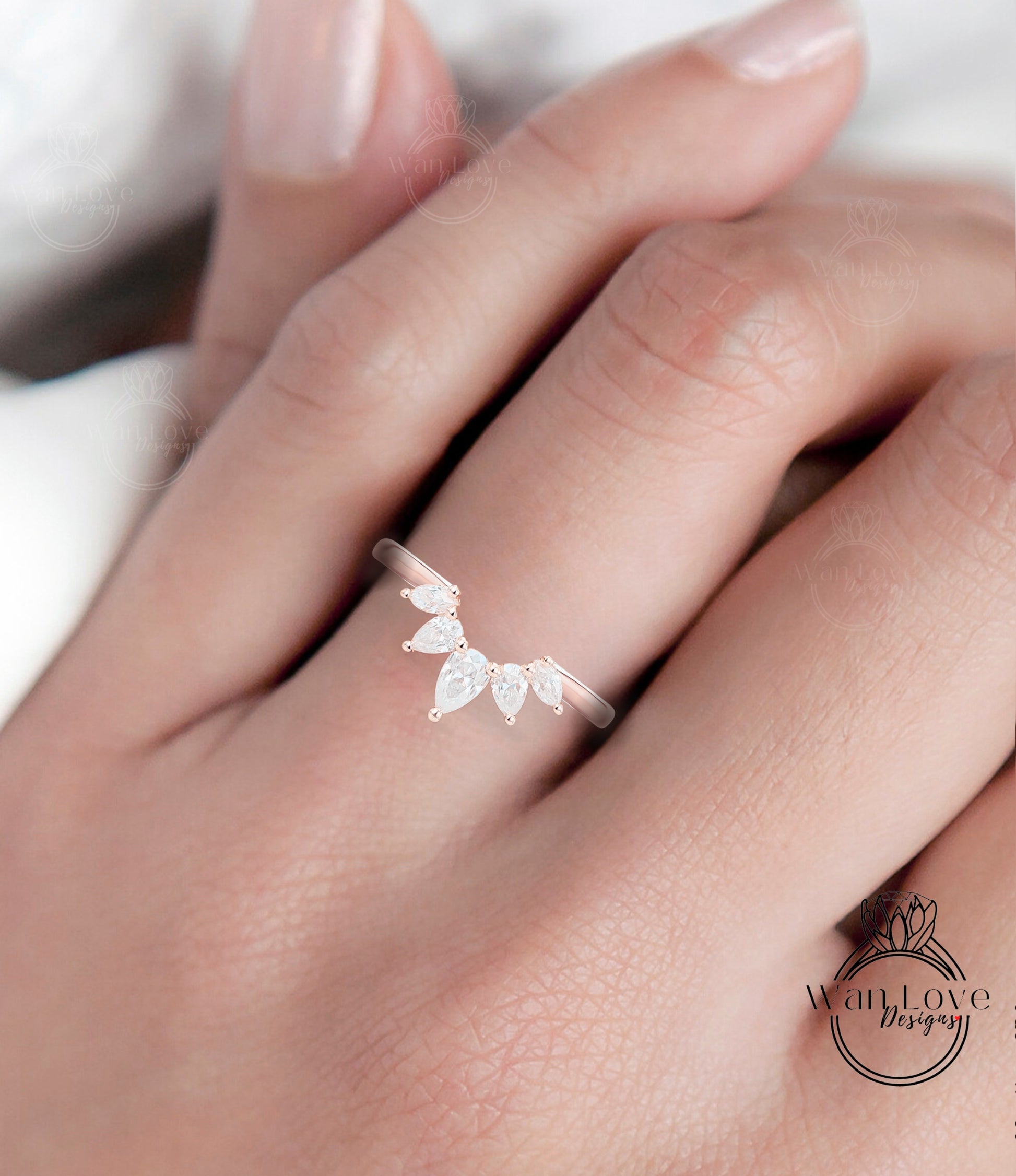 Fede nuziale con diadema di diamanti Moissanite taglio pera, fascia anniversario, fascia pera curva Moissanite, anello nuziale fatto a mano, regalo per lei, sposa