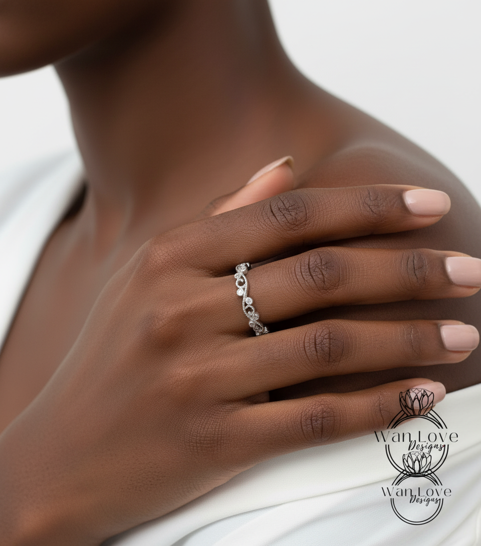 Fede nuziale unica | Fascia con diamanti Moissanite a taglio rotondo | Fede nuziale in stile antico | Anello vintage in oro con diamanti | Anello impilabile | Fascia a spirale