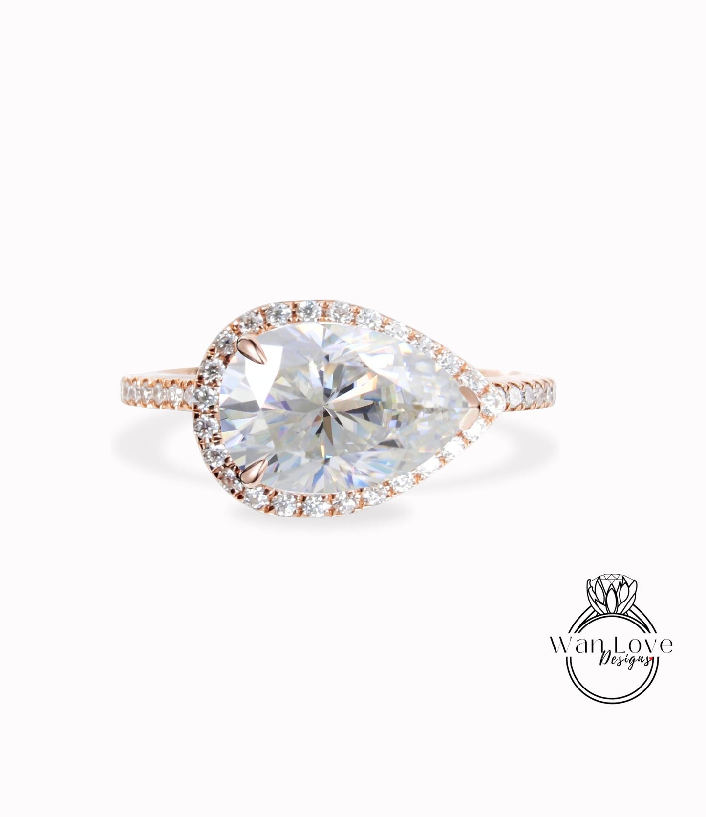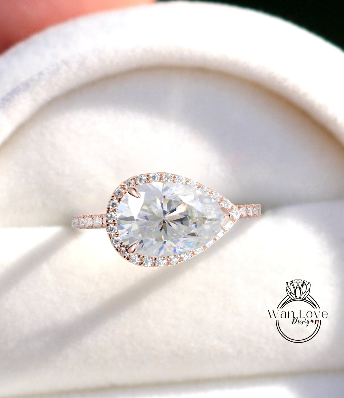 Anello di fidanzamento East West/Anello di nozze di diamante Moissanite pera Halo/Anello di fidanzamento Moissanite/Anello impilabile/Anello di promessa/Anello in oro rosa